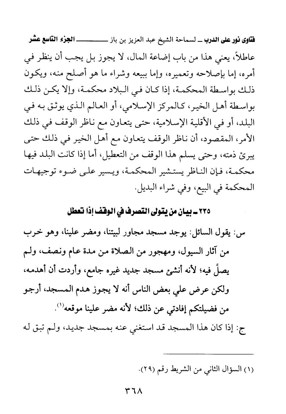 عاطلاً، يعني هذا من باب إضاعة المال، لا يجوز بل يجب أن ينظر في أمره، إما بإصلاحه وتعميره، وإما ببيعه وشراء ما هو أصلح منه، ويكون ذلك بواسطة المحكمة، إذا كان في البلاد محكمة، وإلا يكن ذلك بواسطة أهل الخير، كالمركز الإسلامي، أو العالم الذي يوثق به في البلد، أو في الأقلية الإسلامية، حتى يتعاون مع ناظر الوقف في ذلك الأمر، المقصود، أن ناظر الوقف يتعاون مع أهل الخير في ذلك حتى يبرئ ذمته، وحتى يسلم هذا الوقف من التعطيل، أما إذا كانت البلد فيها محكمة، فإن الناظر يستشير المحكمة، ويسير على ضوء توجيهات المحكمة في البيع، وفي شراء البديل.