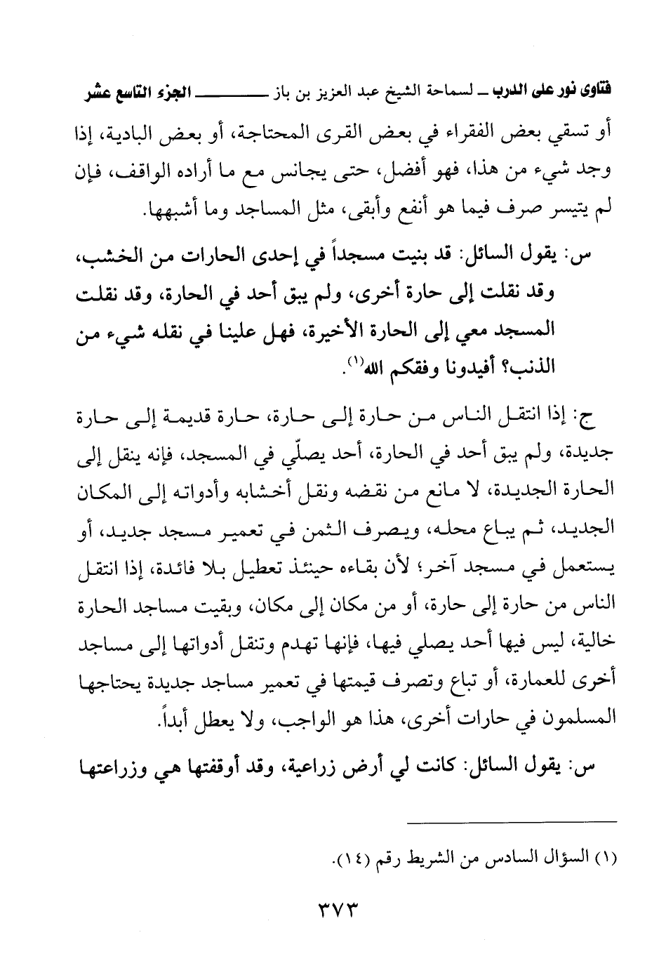 ج: إذا انتقل الناس من حارة إلى حارة، حارة قديمة إلى حارة جديدة، ولم يبق أحد في الحارة، أحد يصلّي في المسجد، فإنه ينقل إلى الحارة الجديدة، لا مانع من نقضه ونقل أخشابه وأدواته إلى المكان الجديد، ثم يباع محله، ويصرف الثمن في تعمير مسجد جديد، أو يستعمل في مسجد آخر، لأن بقاءه حينئذ تعطيل بلا فائدة، إذا انتقل الناس من حارة إلى حارة، أو من مكان إلى مكان، وبقيت مساجد الحارة خالية، ليس فيها أحد يصلي فيها، فإنها تهدم وتنقل أدواتها إلى مساجد أخرى للعمارة، أو تباع وتصرف قيمتها في تعمير مساجد جديدة يحتاجها المسلمون في حارات أخرى، هذا هو الواجب، ولا يعطل أبدًا.