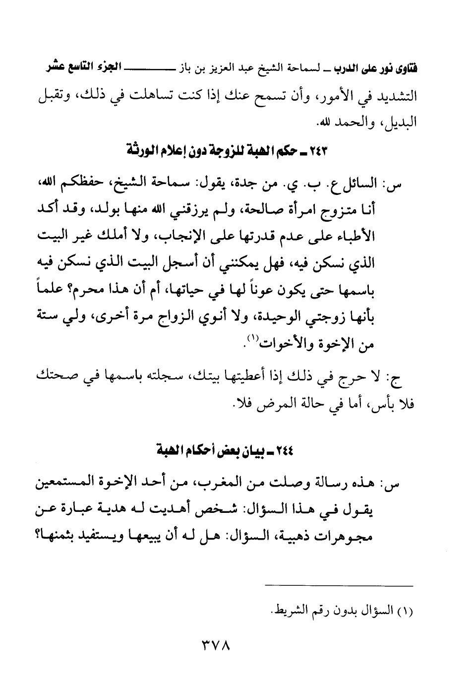 243 - حكم الهبة للزوجة دون إعلام الورثة