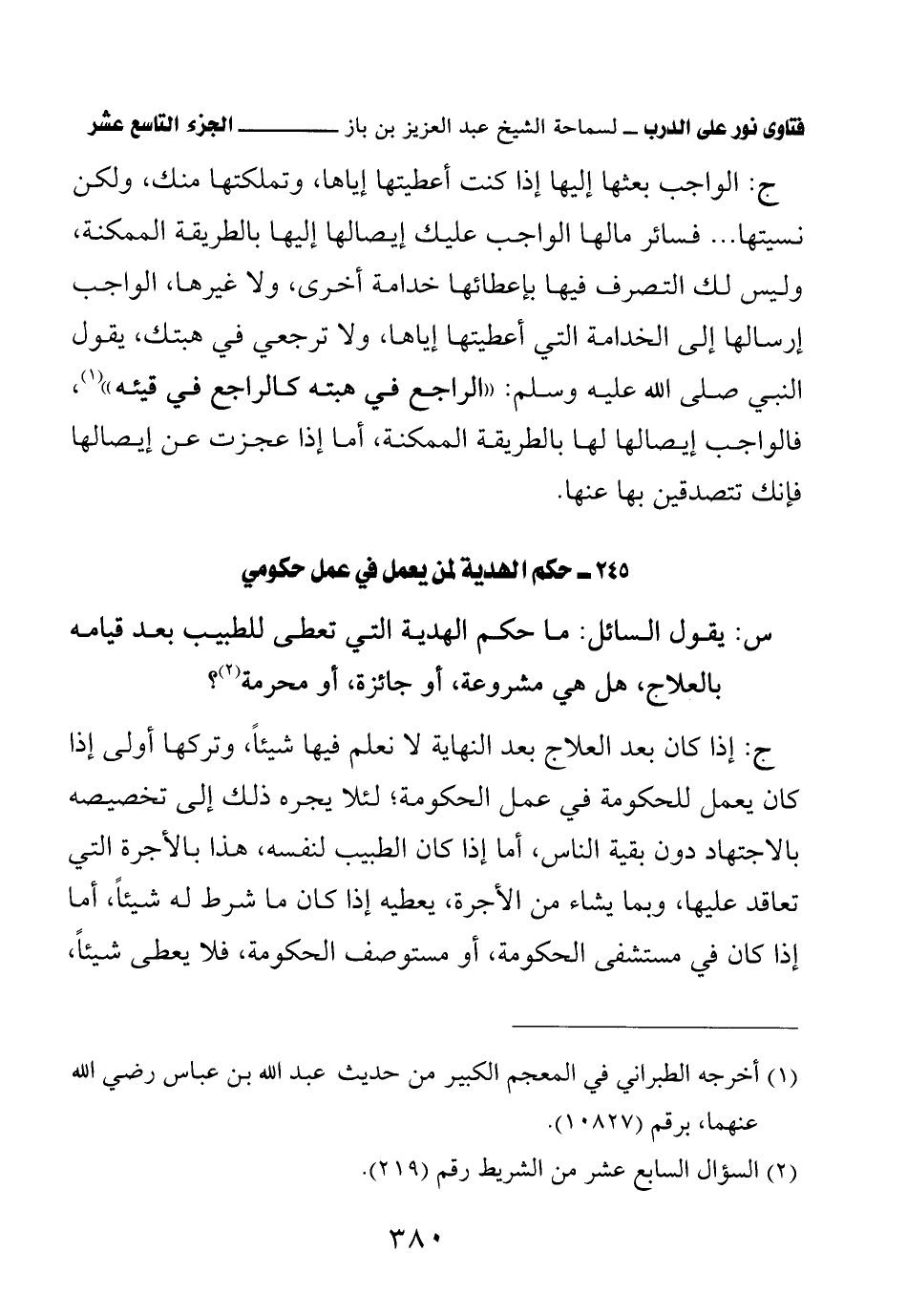 ج: إذا كان بعد العلاج بعد النهاية لا نعلم فيها شيئًا، وتركها أولى إذا كان يعمل للحكومة في عمل الحكومة، لئلا يجره ذلك إلى تخصيصه بالاجتهاد دون بقية الناس، أما إذا كان الطبيب لنفسه، هذا بالأجرة التي تعاقد عليها، وبما يشاء من الأجرة، يعطيه إذا كان ما شرط له شيئًا، أما إذا كان في مستشفى الحكومة، أو مستوصف الحكومة، فلا يعطى شيئًا،