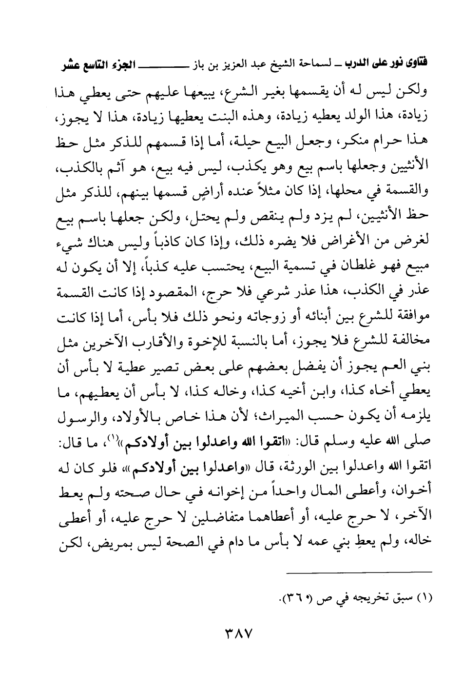 ولكن ليس له أن يقسمها بغير الشرع، يبيعها عليهم حتى يعطي هذا زيادة، هذا الولد يعطيه زيادة، وهذه البنت يعطيها زيادة، هذا لا يجوز، هذا حرام منكر، وجعل البيع حيلة، أما إذا قسمهم للذكر مثل حظ الأنثيين وجعلها باسم بيع وهو يكذب، ليس فيه بيع، هو آثم بالكذب، والقسمة في محلها، إذا كان مثلاً عنده أراضٍ قسمها بينهم، للذكر مثل حظ الأنثيين، لم يزد ولم ينقص ولم يحتل، ولكن جعلها باسم بيع لغرض من الأغراض فلا يضره ذلك، وإذا كان كاذبًا وليس هناك شيء مبيع فهو غلطان في تسمية البيع، يحتسب عليه كذبًا، إلا أن يكون له عذر في الكذب، هذا عذر شرعي فلا حرج، المقصود إذا كانت القسمة موافقة للشرع بين أبنائه أو زوجاته ونحو ذلك فلا بأس، أما إذا كانت مخالفة للشرع فلا يجوز، أما بالنسبة للإخوة والأقارب الآخرين مثل بني العم يجوز أن يفضل بعضهم على بعض تصير عطية لا بأس أن يعطي أخاه كذا، وابن أخيه كذا، وخاله كذا، لا بأس أن يعطيهم، ما يلزمه أن يكون حسب الميراث، لأن هذا خاص بالأولاد، والرسول صلى الله عليه وسلم قال: «اتقوا الله واعدلوا بين أولادم» (¬1) ما قال: «اتقوا الله واعدلوا بين الورثة، قال: واعدلوا بين أولادكم» (¬2). فلو كان له أخوان، وأعطى المال واحدًا من إخوانه في حال صحته ولم يعط الآخر، لا حرج عليه، أو أعطاهما متفاضلين لا حرج عليه، أو أعطى خاله، ولم يعطِ بني عمه لا بأس ما دام في الصحة ليس بمريض، لكن