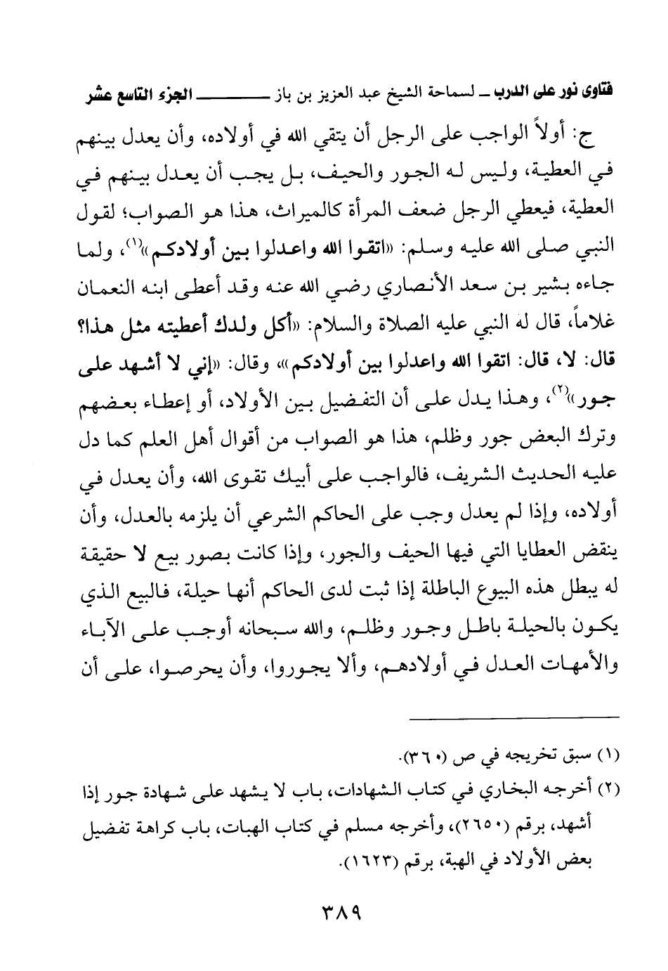 (¬2) أخرجه البخاري في كتاب الشهادات، باب لا يشهد على شهادة جور إذا أشهد، برقم (2650)، وأخرجه مسلم في كتاب الهبات، باب كراهة تفضيل بعض الأولاد في الهبة، برقم (1623).