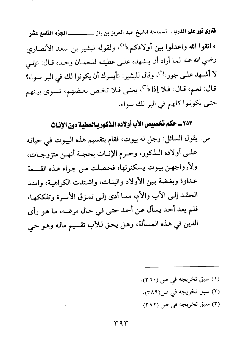 (¬3) أخرجه مسلم في كتاب الهبات، باب كراهة تفضيل بعض الأولاد في الهبة، برقم (1623).