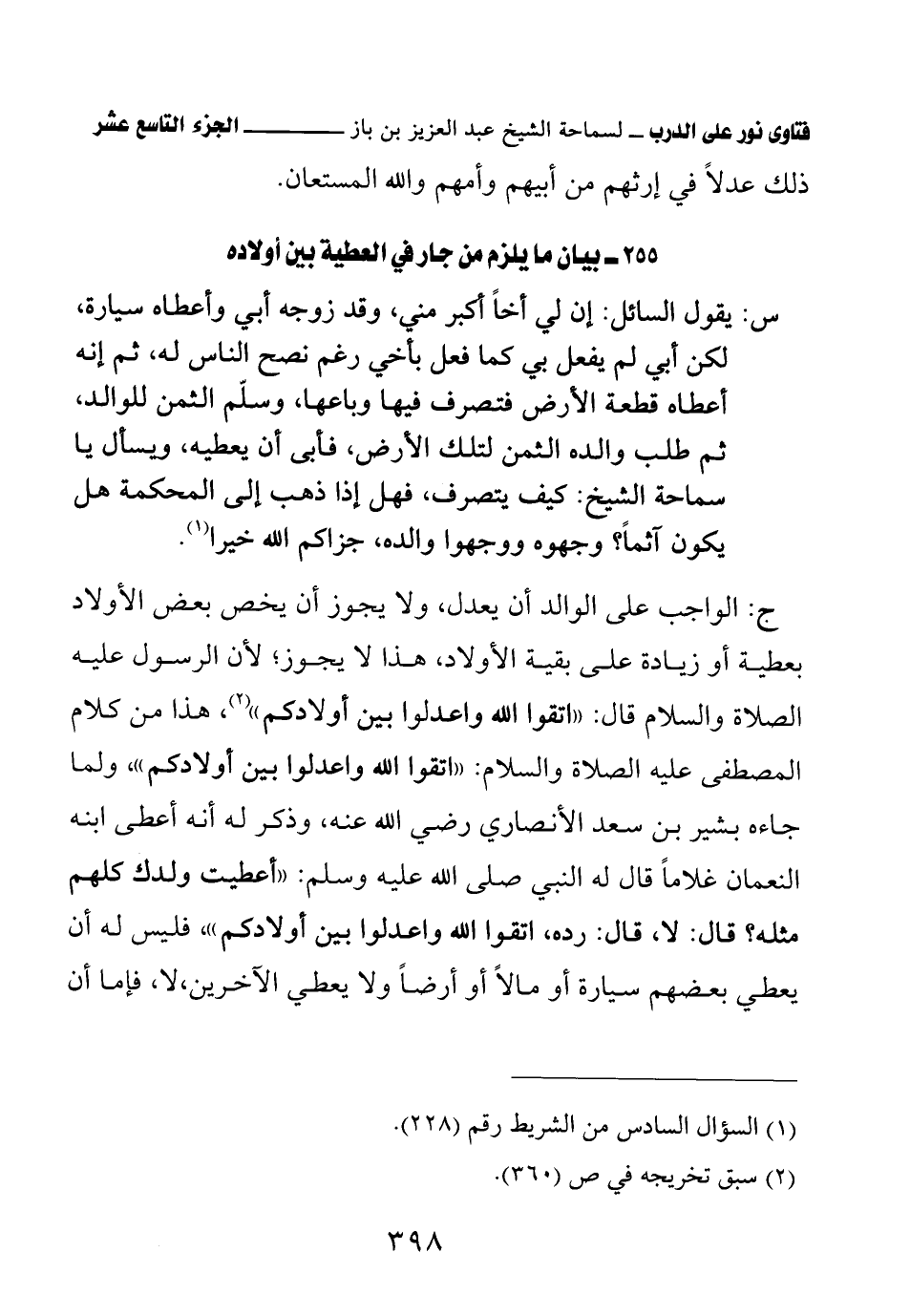 ج: الواجب على الوالد أن يعدل، ولا يجوز أن يخص بعض الأولاد بعطية أو زيادة على بقية الأولاد، هذا لا يجوز، لأن الرسول عليه الصلاة والسلام قال: «اتقوا الله واعدلوا بين أولادكم» (¬3) هذا من كلام المصطفى عليه الصلاة والسلام: «اتقوا الله واعدلوا بين أولادكم» (¬4). «ولما جاءه بشير بن سعد الأنصاري رضي الله عنه، وذكر له أنه أعطى ابنه النعمان غلامًا قال له النبي صلى الله عليه وسلم: أعطيت ولدك كلهم مثله؟ قال: لا، قال: رده، اتقوا الله واعدلوا بين أولادكم» (¬5). فليس له أن يعطي بعضهم سيارة أو مالاً أو أرضًا ولا يعطي الآخرين، لا، فإما أن