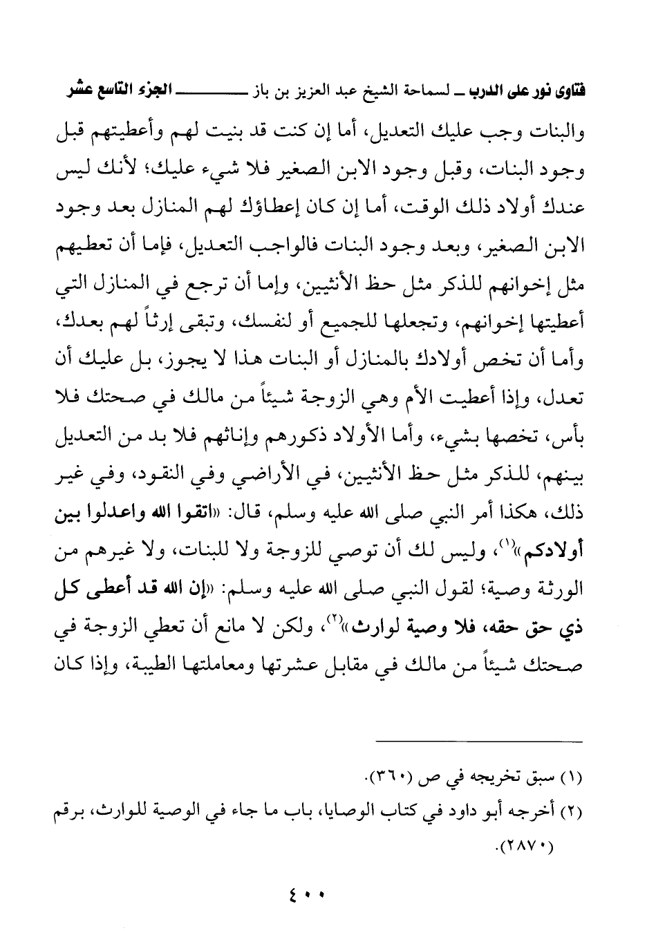 والبنات وجب عليك التعديل، أما إن كنت قد بنيت لهم وأعطيتهم قبل وجود البنات، وقبل وجود الابن الصغير فلا شيء عليك، لأنك ليس عندك أولاد ذلك الوقت، أما إن كان إعطاؤك لهم المنازل بعد وجود الابن الصغير، وبعد وجود البنات فالواجب التعديل فإما أن تعطيهم مثل إخوانهم للذكر مثل حظ الأنثيين، وإما أن ترجع في المنازل التي أعطيتها إخوانهم، وتجعلها للجميع أو لنفسك، وتبقى إرثًا لهم بعدك، وأما أن تخص أولادك بالمنازل أو البنات هذا لا يجوز، بل عليك أن تعدل، وإذا أعطيت الأم وهي الزوجة شيئًا من مالك في صحتك فلا بأس، تخصها بشيء، وأما الأولاد ذكورهم وإناثهم فلا بد من التعديل بينهم، للذكر مثل حظ الأنثيين، في الأراضي وفي النقود، وفي غير ذلك، هكذا أمر النبي صلى الله عليه وسلم: «اتقوا الله واعدلوا بين أولادكم» (¬1) وليس لك أن توصي للزوجة ولا للبنات، ولا غيرهم من الورثة وصية، لقول النبي صلى الله عليه وسلم: «إن الله قد أعطى كل ذي حق حقه، فلا وصية لوارث» (¬2) ولكن لا مانع أن تعطي الزوجة في صحتك شيئًا من مالك في مقابل عشرتها ومعاملتها الطيبة، وإذا كان