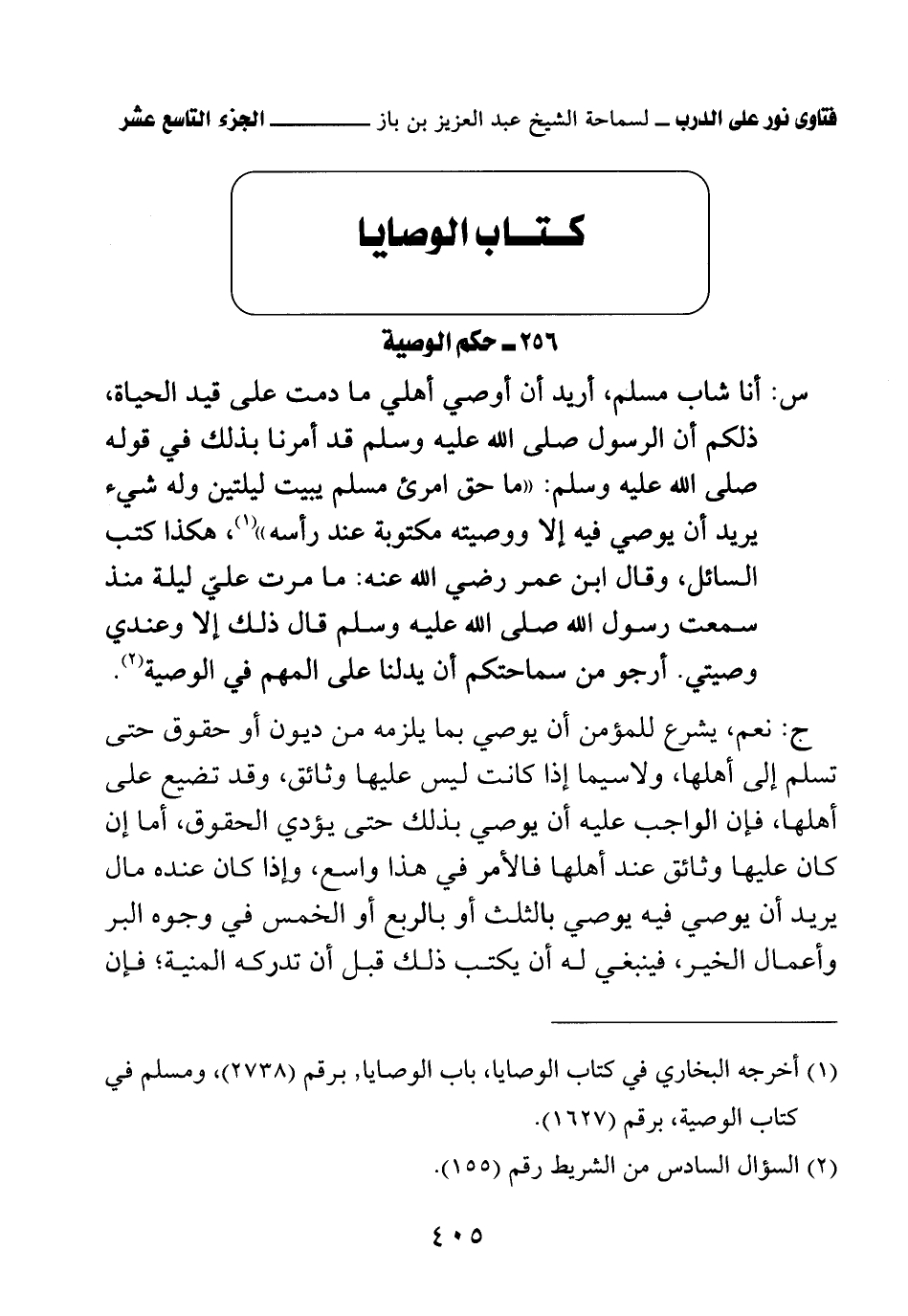 س: أنا شاب مسلم، أريد أن أوصي أهلي ما دمت على قيد الحياة، ذلكم أن الرسول صلى الله عليه وسلم قد أمرنا بذلك في قوله صلى الله عليه وسلم: «ما حق امرئ مسلم يبيت ليلتين وله شيء يريد أن يوصي فيه إلا ووصيته مكتوبة عند رأسه» (¬1) هكذا كتب السائل، وقال ابن عمر رضي الله عنه: ما مرت عليَّ ليلة منذ سمعت رسول الله صلى الله عليه وسلم قال ذلك إلا وعندي وصيتي. أرجو من سماحتكم أن يدلنا على المهم في الوصية (¬2).