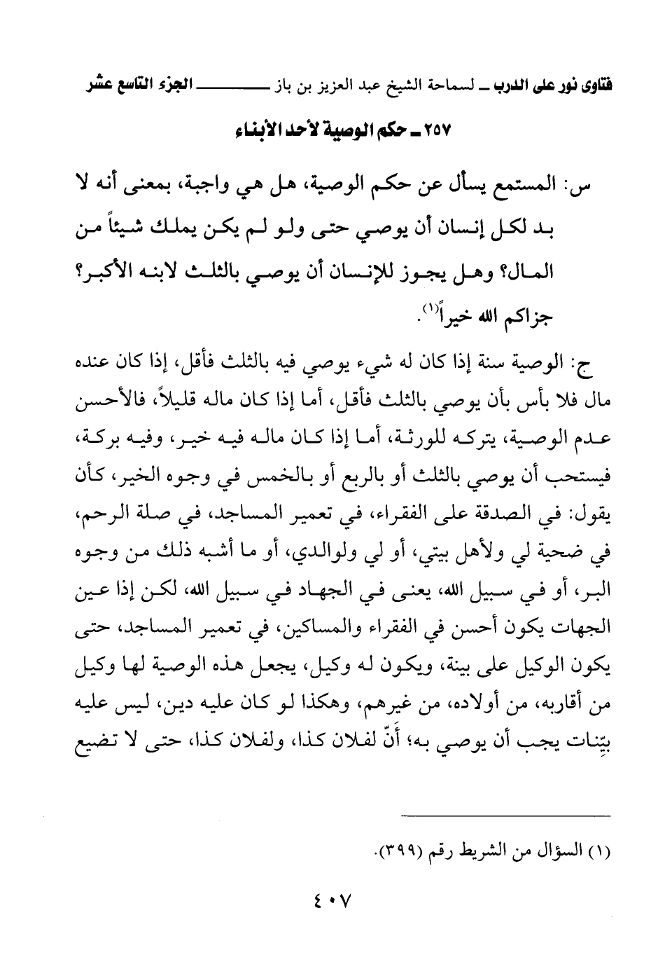 ج: الوصية سنة إذا كان له شيء يوصي فيه بالثلث فأقل، إذا كان عنده مال فلا بأس بأن يوصي بالثلث فأقل، أما إذا كان ماله قليلاً، فالأحسن عدم الوصية، يتركه للورثة، أما إذا كان ماله فيه خير، وفيه بركة فيستحب أن يوصي بالثلث أو بالربع أو بالخمس في وجوه الخير، كأن يقول: في الصدقة على الفقراء في تعمير المساجد، في صلة الرحم، في ضحية لي ولأهل بيتي، أو لي ولوالدي، أو ما أشبه ذلك من وجوه البر، أو في سبيل الله، يعني في الجهاد في سبيل الله، لكن إذا عين الجهات يكون أحسن في الفقراء والمساكين، في تعمير المساجد، حتى يكون الوكيل على بينة، ويكون له وكيل، يجعل هذه الوصية لها وكيل من أقاربه، من أولاده، من غيرهم، وهكذا لو كان عليه دين، ليس عليه بيِّنات يجب أن يوصي به، أَنّ لفلان كذا، ولفلان كذا، حتى لا تضيع
