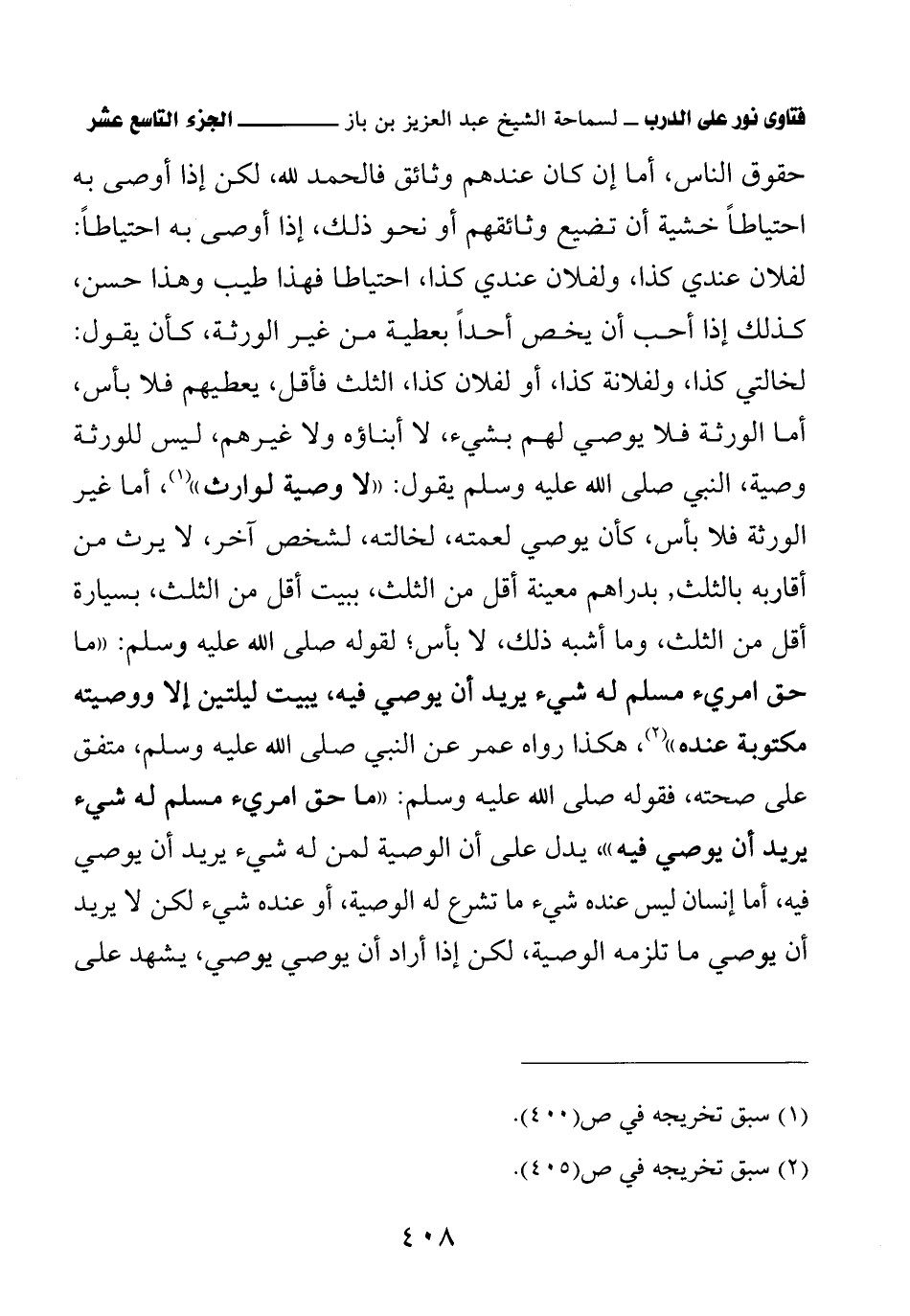 حقوق الناس، أما إن كان عندهم وثائق فالحمد لله، لكن إذا أوصى به احتياطًا خشية أن تضيع وثائقهم أو نحو ذلك، إذا أوصى به احتياطًا: لفلان عندي كذا، ولفلان عندي كذا، احتياطا فهذا طيب وهذا حسن، كذلك إذا أحب أن يخص أحدًا بعطية من غير الورثة، كأن يقول: لخالتي كذا، ولفلانة كذا، أو لفلان كذا، الثلث فأقل، يعطيهم فلا بأس، أما الورثة فلا يوصي لهم بشيء، لا أبناؤه ولا غيرهم، ليس للورثة وصية، النبي صلى الله عليه وسلم يقول: «لا وصية لوارث» (¬1) أما غير الورثة فلا بأس، كأن يوصي لعمته، لخالته، لشخص آخر، لا يرث من أقاربه بالثلث، بدراهم معينة أقل من الثلث، ببيت أقل من الثلث، بسيارة أقل من الثلث، وما أشبه ذلك، لا بأس؛ لقوله صلى الله عليه وسلم: «ما حق امرئ مسلم له شيء يريد أن يوصي فيه، يبيت ليلتين إلا ووصيته مكتوبة عنده» (¬2) هكذا رواه ابن عمر عن النبي صلى الله عليه وسلم، متفق على صحته، فقوله صلى الله عليه وسلم: «ما حق امرئ مسلم له شيء يريد أن يوصي فيه» (¬3). يدل على أن الوصية لمن له شيء يريد أن يوصي فيه، أما إنسان ليس عنده شيء ما تشرع له الوصية، أو عنده شيء لكن لا يريد أن يوصي ما تلزمه الوصية، لكن إذا أراد أن يوصي يوصي، يشهد على