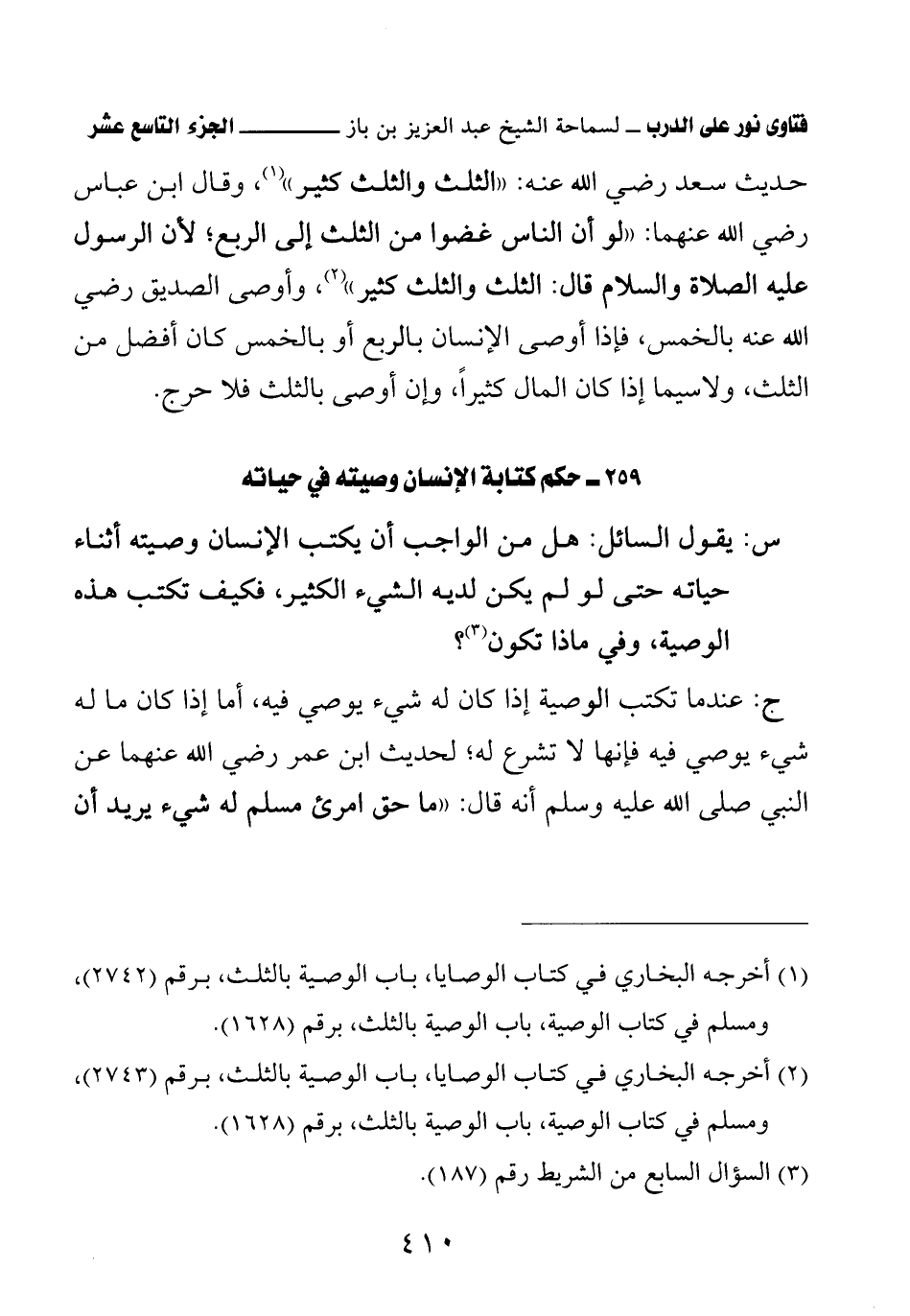 (¬1) أخرجه البخاري في كتاب الوصايا، باب الوصية بالثلث، برقم (2742)، ومسلم في كتاب الوصية، باب الوصية بالثلث، برقم (1628).