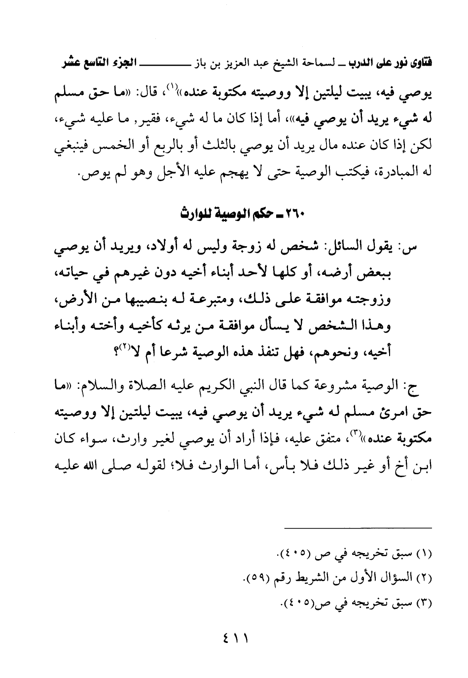 ج: الوصية مشروعة كما قال النبي الكريم عليه الصلاة والسلام: «ما حق امرئ مسلم له شيء يريد أن يوصي فيه، يبيت ليلتين إلا ووصيته مكتوبة عنده» (¬2) متفق عليه، فإذا أراد أن يوصي لغير وارث، سواء كان ابن أخ أو غير ذلك فلا بأس، أما الوارث فلا؛ لقوله صلى الله عليه