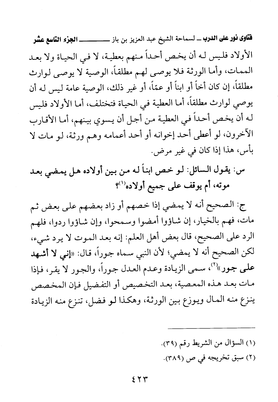 ج: الصحيح أنه لا يمضي إذا خصهم أو زاد بعضهم على بعض ثم مات، فهم بالخيار، إن شاؤوا أمضوا وسمحوا، وإن شاؤوا ردوا، فلهم الرد على الصحيح، قال بعض أهل العلم: إنه بعد الموت لا يرد شيء، لكن الصحيح أنه لا يمضي، لأن النبي سماه جورًا، قال: «إني لا أشهد على جور» (¬1) سمى الزيادة وعدم العدل جورًا، والجور لا يقر، فإذا مات بعد هذه المعصية، بعد التخصيص أو التفضيل فإن المخصص ينزع منه المال ويوزع بين الورثة، وهكذا لو فضل، تنزع منه الزيادة