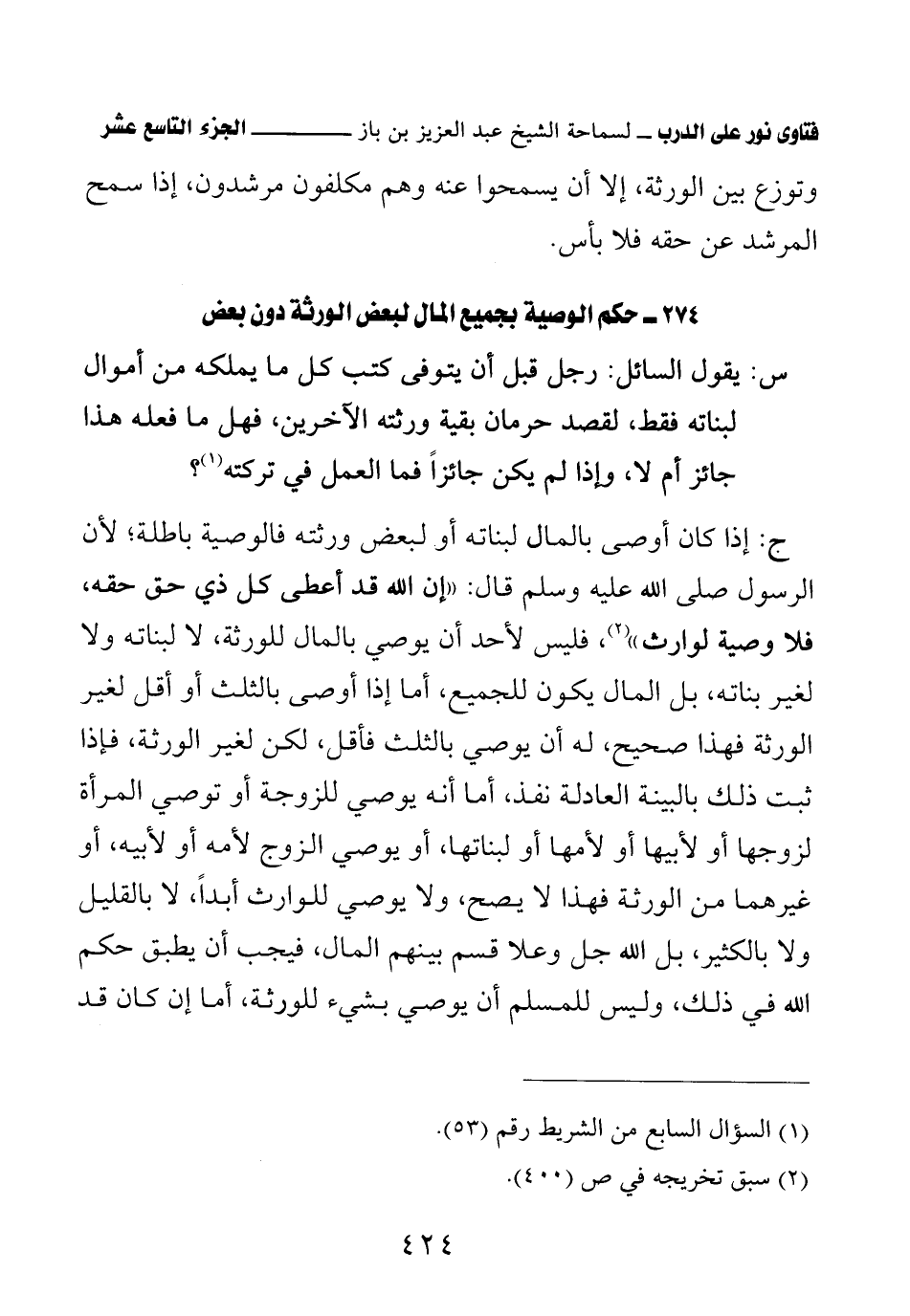 ج: إذا كان أوصى بالمال لبناته أو لبعض ورثته فالوصية باطلة، لأن الرسول صلى الله عليه وسلم قال: «إن الله قد أعطى كل ذي حق حقه، فلا وصية لوارث» (¬3) فليس لأحد أن يوصي بالمال للورثة، لا لبناته ولا لغير بناته، بل المال يكون للجميع، أما إذا أوصى بالثلث أو أقل لغير الورثة فهذا صحيح، له أن يوصي بالثلث فأقل، لكن لغير الورثة، فإذا ثبت ذلك بالبينة العادلة نفذ، أما أنه يوصي للزوجة أو توصي المرأة لزوجها أو لأبيها أو لأمها أو لبناتها، أو يوصي الزوج لأمه أو لأبيه، أو غيرهما من الورثة فهذا لا يصح، ولا يوصي للوارث أبدًا، لا بالقليل ولا بالكثير، بل الله جل وعلا قسم بينهم المال، فيجب أن يطبق حكم الله في ذلك، وليس للمسلم أن يوصي بشيء للورثة، أما إن كان قد