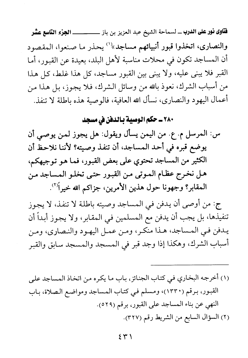 والنصارى، اتخذوا قبور أنبيائهم مساجد» (¬1) يحذر ما صنعوا المقصود أن المساجد تكون في محلات مناسبة لأهل البلد، بعيدة عن القبور، أما القبر فلا يبنى عليه، ولا يبنى بين القبور مساجد، كل هذا غلط كل هذا من أسباب الشرك، نعوذ بالله من وسائل الشرك، فلا يجوز، بل هذا من أعمال اليهود والنصارى، نسأل الله العافية، فالوصية هذه باطلة لا تنفذ.