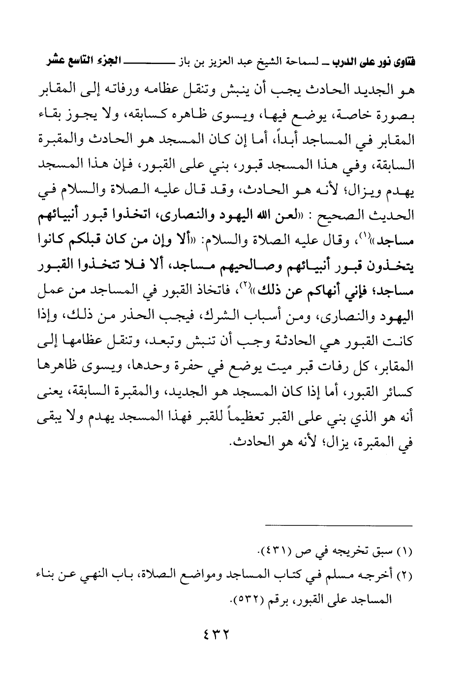 هو الجديد الحادث يجب أن ينبش وتنقل عظامه ورفاته إلى المقابر بصورة خاصة، يوضع فيها، ويسوى ظاهره كسابقه، ولا يجوز بقاء المقابر في المساجد أبدًا، أما إن كان المسجد هو الحادث والمقبرة السابقة، وفي هذا المسجد قبور، بني على القبور، فإن هذا المسجد يهدم ويزال، لأنه هو الحادث، وقد قال عليه الصلاة والسلام في الحديث الصحيح: «لعن الله اليهود والنصارى، اتخذوا قبور أنبيائهم مساجد» (¬1) وقال عليه الصلاة والسلام: «ألا وإن من كان قبلكم كانوا يتخذون قبور أنبيائهم وصالحيهم مساجد، ألا فلا تتخذوا القبور مساجد، فإني أنهاكم عن ذلك» (¬2) فاتخاذ القبور في المساجد من عمل اليهود والنصارى، ومن أسباب الشرك فيجب الحذر من ذلك، وإذا كانت القبور هي الحادثة وجب أن تنبش وتبعد، وتنقل عظامها إلى المقابر، كل رفات قبر ميت يوضع في حفرة وحدها، ويسوى ظاهرها كسائر القبور، أما إذا كان المسجد هو الجديد، والمقبرة السابقة، يعنى أنه هو الذي بني على القبر تعظيمًا للقبر فهذا المسجد يهدم ولا يبقى في المقبرة، يزال لأنه هو الحادث.