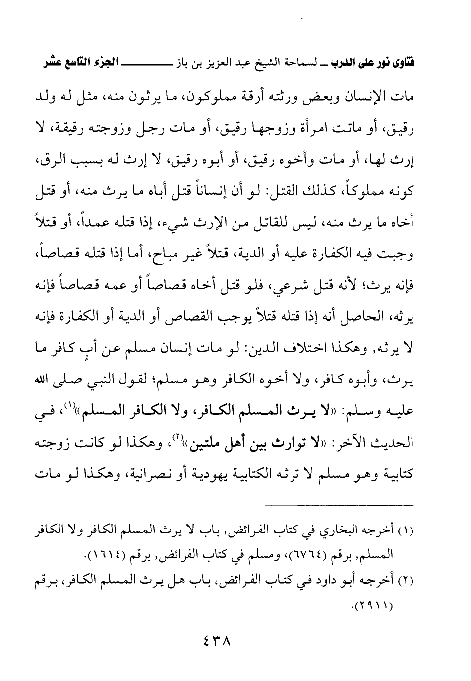 مات الإنسان وبعض ورثته أرقة مملوكون، ما يرثون منه، مثل له ولد رقيق، أو ماتت امرأة وزوجها رقيق، أو مات رجل وزوجته رقيقة، لا إرث لها، أو مات وأخوه رقيق، أو أبوه رقيق، لا إرث له بسبب الرق، كونه مملوكًا، كذلك القتل: لو أن إنسانًا قتل أباه ما يرث منه، أو قتل أخاه ما يرث منه، ليس للقاتل من الإرث شيء، إذا قتله عمدًا، أو قتلاً وجبت فيه الكفارة عليه أو الدية، قتلاً غير مباح، أما إذا قتله قصاصًا، فإنه يرث، لأنه قتل شرعي، فلو قتل أخاه قصاصًا أو عمه قصاصًا فإنه يرثه، الحاصل أنه إذا قتله قتلاً يوجب القصاص أو الدية أو الكفارة فإنه لا يرثه، وهكذا اختلاف الدين، لو مات إنسان مسلم عن أبٍ كافر ما يرث، وأبوه كافر، ولا أخوه الكافر وهو مسلم؛ لقول النبي صلى الله عليه وسلم: «لا يرث المسلم الكافر، ولا الكافر المسلم» (¬1) في الحديث الآخر: «لا توارث بين أهل ملتين» (¬2) وهكذا لو كانت زوجته كتابية وهو مسلم لا ترثه الكتابية يهودية أو نصرانية، وهكذا لو مات