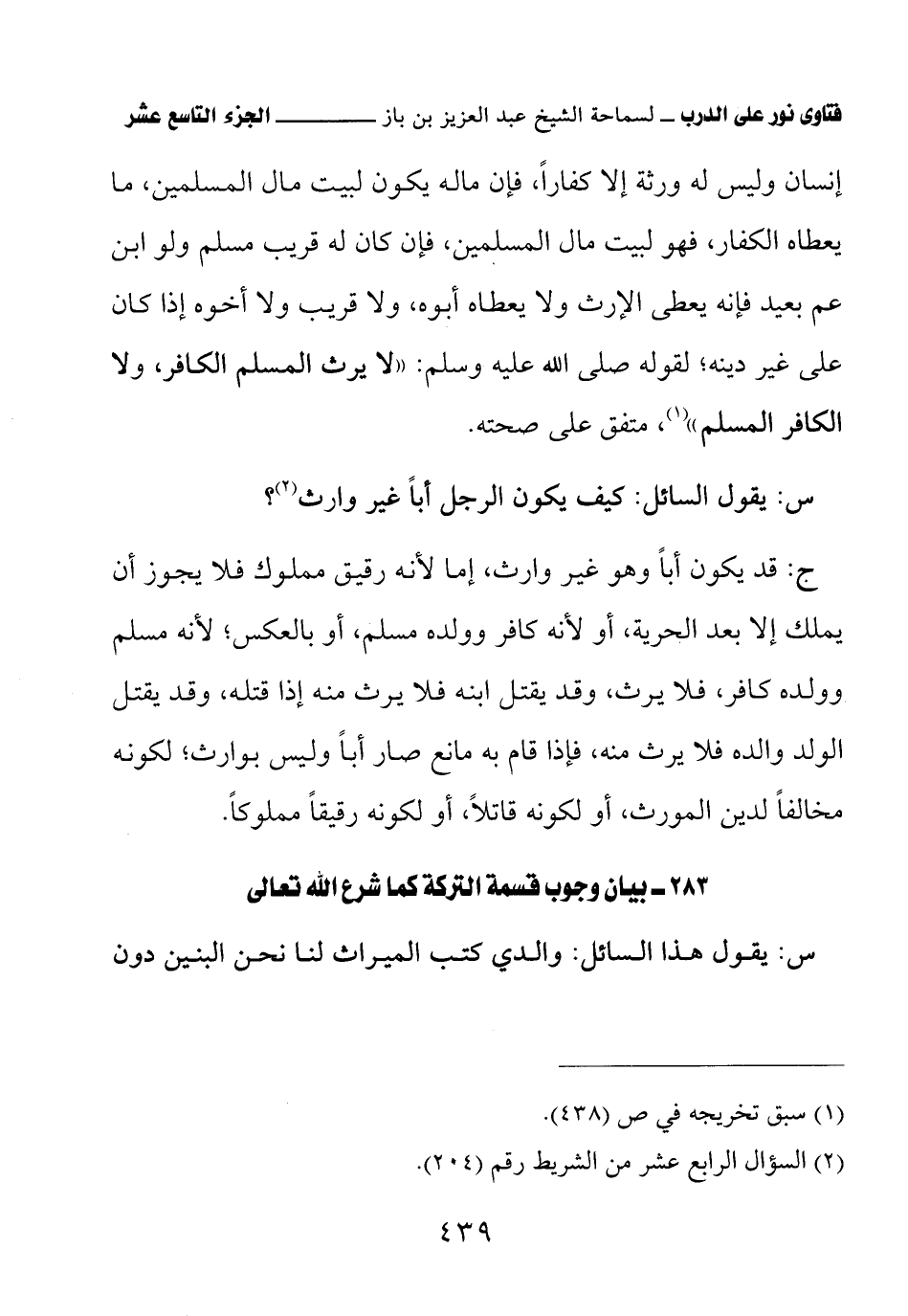 ج: قد يكون أبًا وهو غير وارث، إما لأنه رقيق مملوك فلا يجوز أن يملك إلا بعد الحرية، أو لأنه كافر وولده مسلم، أو بالعكس، لأنه مسلم وولده كافر، فلا يرث، وقد يقتل ابنه فلا يرث منه إذا قتله، وقد يقتل الولد والده فلا يرث منه، فإذا قام به مانع صار أبًا وليس بوارث، لكونه مخالفًا لدين المورث، أو لكونه قاتلاً، أو لكونه رقيقًا مملوكًا.