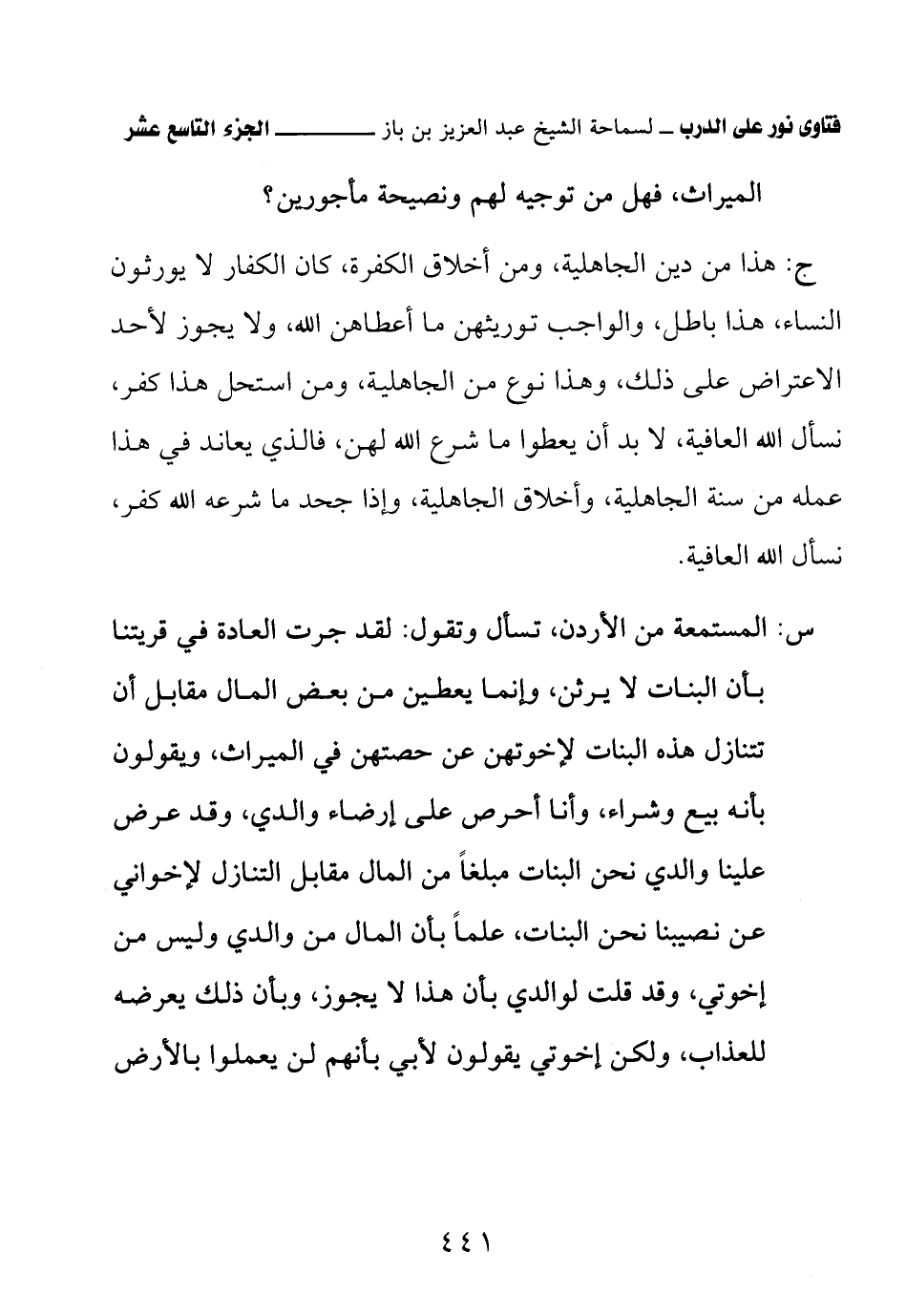 ج: هذا من دين الجاهلية، ومن أخلاق الكفرة، كان الكفار لا يورثون النساء، هذا باطل، والواجب توريثهن ما أعطاهن الله، ولا يجوز لأحد الاعتراض على ذلك، وهذا نوع من الجاهلية، ومن استحل هذا كفر، نسأل الله العافية، لا بد أن يعطوا ما شرع الله لهن، فالذي يعاند في هذا عمله من سنة الجاهلية، وأخلاق الجاهلية، وإذا جحد ما شرعه الله كفر، نسأل الله العافية.