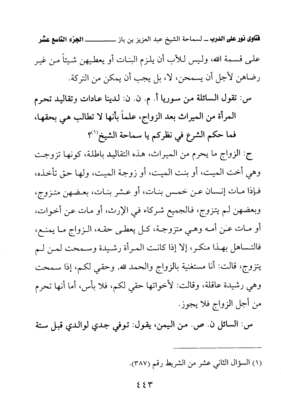 ج: الزواج ما يحرم من الميراث، هذه التقاليد باطلة، كونها تزوجت وهي أخت الميت، أو بنت الميت، أو زوجة الميت، ولها حق تأخذه، فإذا مات إنسان عن خمس بنات، أو عشر بنات، بعضهن متزوج، وبعضهن لم يتزوج، فالجميع شركاء في الإرث، أو مات عن أخوات، أو مات عن أمه وهي متزوجة، كل يعطى حقه، الزواج ما يمنع، فالتساهل بهذا منكر، إلا إذا كانت المرأة رشيدة وسمحت لمن لم يتزوج، قالت: أنا مستغنية بالزواج والحمد لله، وحقي لكم، إذا سمحت وهي رشيدة عاقلة، وقالت: لأخواتها حقي لكم، فلا بأس، أما أنها تحرم من أجل الزواج فلا يجوز.