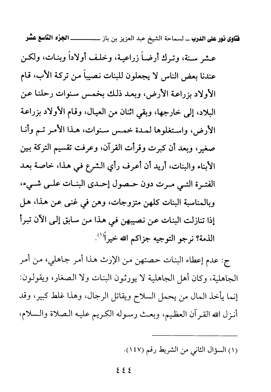 عشر سنة، وترك أرضًا زراعية، وخلف أولادًا وبنات، ولكن عندنا بعض الناس لا يجعلون للبنات نصيبًا من تركة الأب، قام الأولاد بزراعة الأرض، وبعد ذلك بخمس سنوات رحلنا عن البلاد، إلى خارجها، وبقي اثنان من العيال، وقام الأولاد بزراعة الأرض، واستغلوها لمدة خمس سنوات، هذا الأمر تم وأنا صغير، وبعد أن كبرت وقرأت القرآن، وعرفت تقسيم التركة بين الأبناء والبنات، أريد أن أعرف رأي الشرع في هذا، خاصة بعد الفترة التي مرت دون حصول إحدى البنات على شيء، وبالمناسبة البنات كلهن متزوجات، وهن في غنى عن هذا، هل إذا تنازلت البنات عن نصيبهن في هذا من سابق إلى الآن تبرأ الذمة؟ نرجو التوجيه جزاكم الله خيرًا.