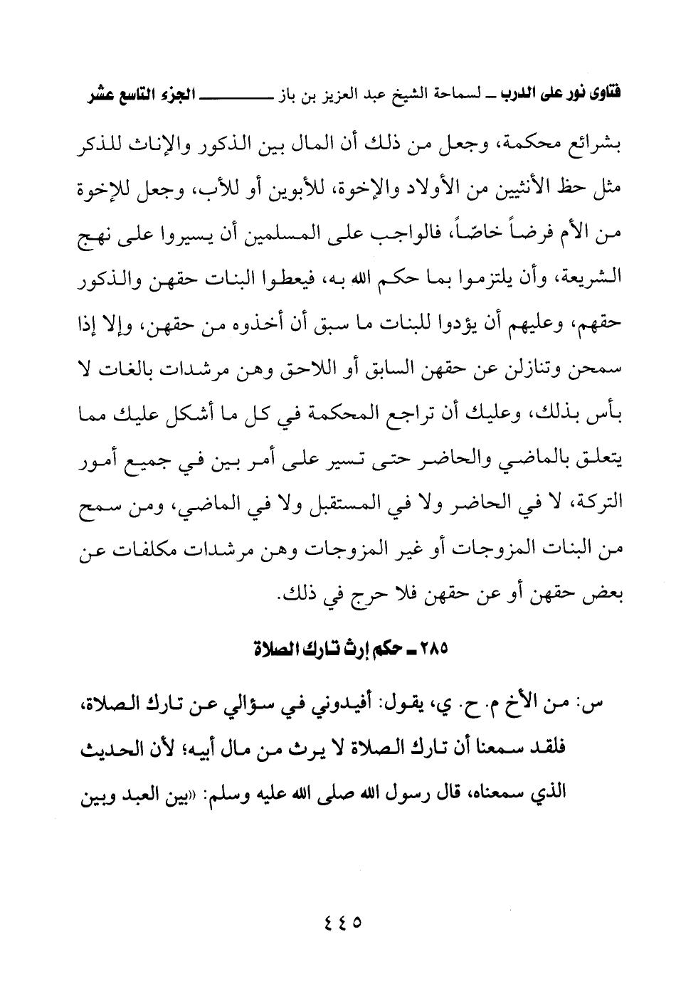 س: من الأخ م. ح. ي، يقول: أفيدوني في سؤالي عن تارك الصلاة، فلقد سمعنا أن تارك الصلاة لا يرث من مال أبيه، لأن الحديث الذي سمعناه، قال رسول الله صلى الله عليه وسلم: «بين العبد وبين