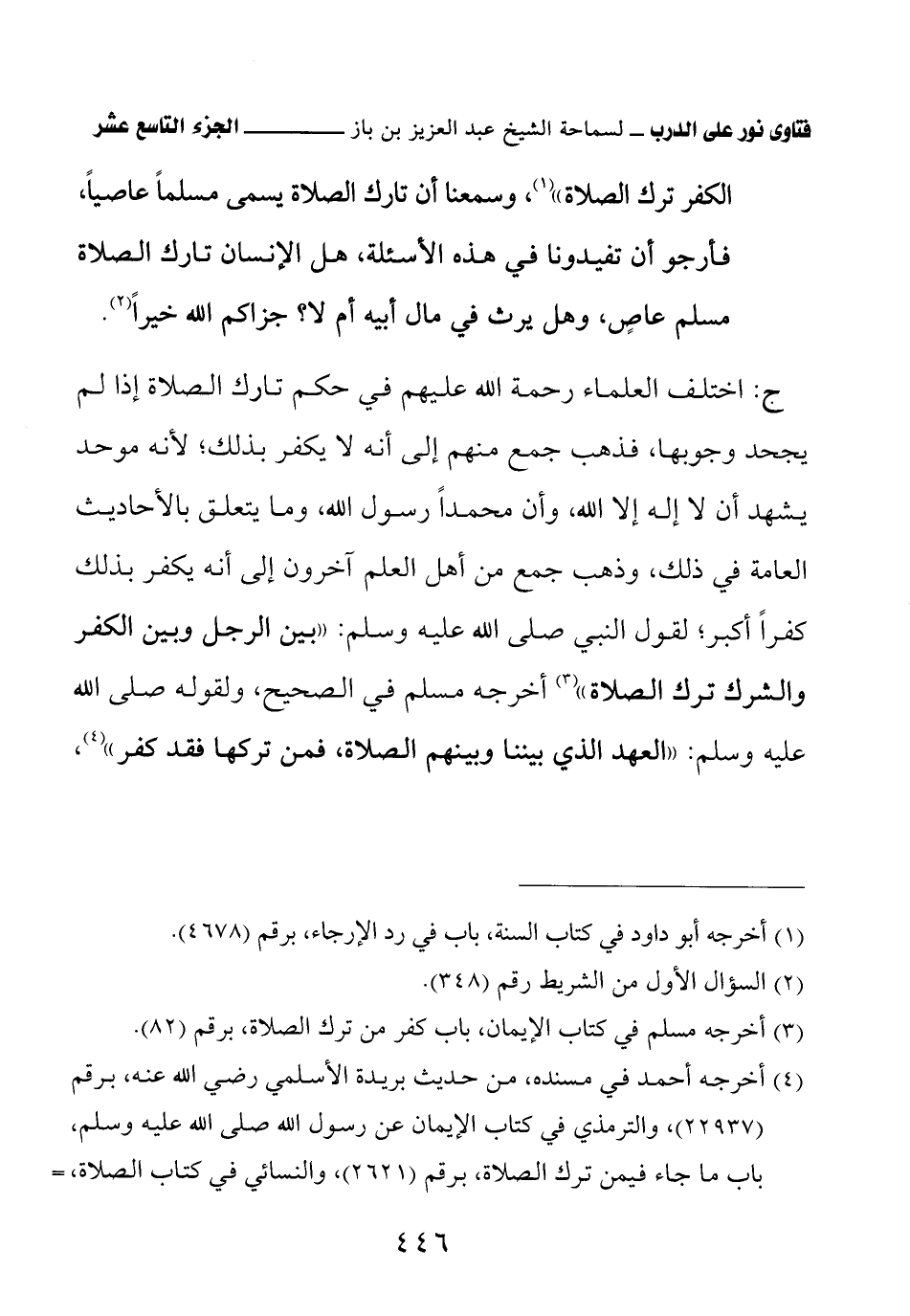 (¬3) أخرجه مسلم في كتاب الإيمان، باب كفر من ترك الصلاة، برقم (82).