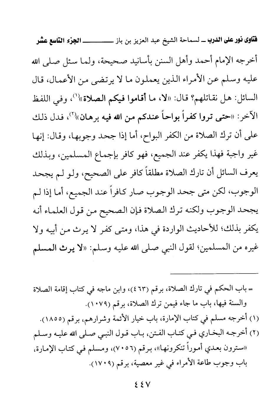 أخرجه الإمام أحمد وأهل السنن بأسانيد صحيحة، «ولما سئل صلى الله عليه وسلم عن الأمراء الذي يعملون ما لا يرتضى من الأعمال، قال السائل: هل نقاتلهم؟ قال: لا، ما أقاموا فيكم الصلاة» (¬1) وفي اللفظ الآخر: «حتى تروا كفرًا بواحًا عندكم من الله فيه برهان» (¬2) فدل ذلك على أن ترك الصلاة من الكفر البواح، أما إذا جحد وجوبها، وقال: إنها غير واجبة فهذا يكفر عند الجميع، فهو كافر بإجماع المسلمين، وبذلك يعرف السائل أن تارك الصلاة مطلقًا كافر على الصحيح، ولو لم يجحد الوجوب، لكن متى جحد الوجوب صار كافرًا عند الجميع، أما إذا لم يجحد الوجوب ولكنه ترك الصلاة فإن الصحيح من قول العلماء أنه يكفر بذلك، للأحاديث الواردة في هذا، ومتى كفر لا يرث من أبيه ولا غيره من المسلمين، لقول النبي صلى الله عليه وسلم: «لا يرث المسلم