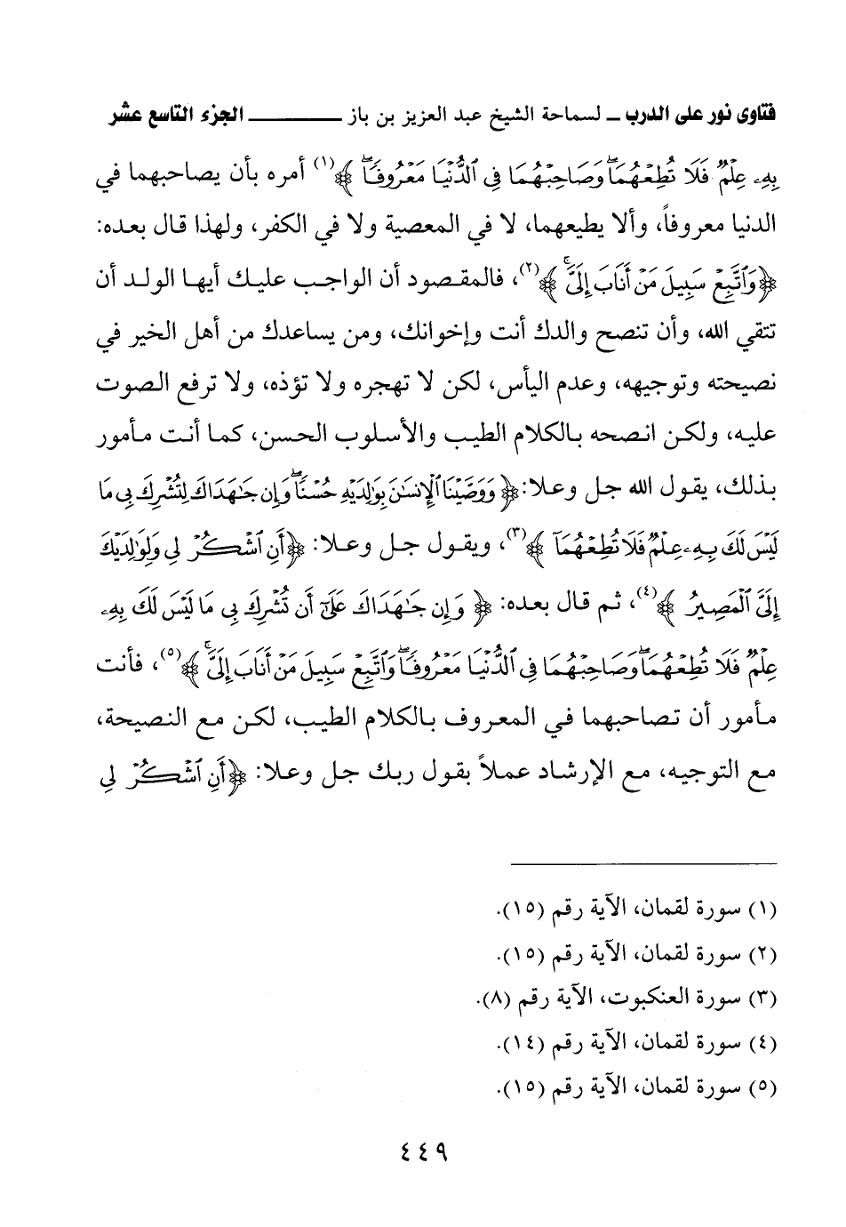 أمره بأن يصاحبها في الدنيا معروفًا، وألا يطيعهما، لا في المعصية ولا في الكفر، ولهذا قال بعده: {وَاتَّبِعْ سَبِيلَ مَنْ أَنَابَ إِلَيَّ}. فالمقصود أن الواجب عليك أيها الولد أن تتقي الله، وأن تنصح والدك أنت وإخوانك، ومن يساعدك من أهل الخير في نصيحته وتوجيهه، وعدم اليأس، لكن لا تهجره ولا تؤذه، ولا ترفع الصوت عليه، ولكن انصحه بالكلام الطيب والأسلوب الحسن، كما أنت مأمور بذلك، يقول الله جل وعلا: {وَوَصَّيْنَا الْإِنْسَانَ بِوَالِدَيْهِ حُسْنًا وَإِنْ جَاهَدَاكَ لِتُشْرِكَ بِي مَا لَيْسَ لَكَ بِهِ عِلْمٌ فَلاَ تُطِعْهُمَا}. ويقول جل وعلا: {أَنِ اشْكُرْ لِي وَلِوَالِدَيْكَ إِلَيَّ الْمَصِيرُ}. ثم قال بعده: {وَإِنْ جَاهَدَاكَ عَلى أَنْ تُشْرِكَ بِي مَا لَيْسَ لَكَ بِهِ عِلْمٌ فَلاَ تُطِعْهُمَا وَصَاحِبْهُمَا فِي الدُّنْيَا مَعْرُوفًا وَاتَّبِعْ سَبِيلَ مَنْ أَنَابَ إِلَيَّ}. فأنت مأمور أن تصاحبهما في المعروف بالكلام الطيب، لكن مع النصيحة، مع التوجيه، مع الإرشاد عملاً بقول ربك جل وعلا: {أَنِ اشْكُرْ لِي وَلِوَالِدَيْكَ}