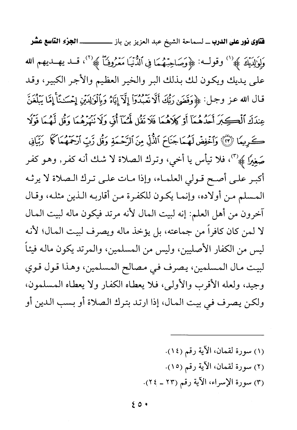 وقوله: {وَصَاحِبْهُمَا فِي الدُّنْيَا مَعْرُوفًا}. قد يهديهم الله على يديك ويكون لك بذلك البر والخير العظيم والأجر الكبير، وقد قال الله عز وجل: {وَقَضَى رَبُّكَ أَلاَّ تَعْبُدُوا إِلاَّ إِيَّاهُ وَبِالْوَالِدَيْنِ إِحْسَانًا إِمَّا يَبْلُغَنَّ عِنْدَكَ الْكِبَرَ أَحَدُهُمَا أَوْ كِلاَهُمَا فَلاَ تَقُلْ لَهُمَا أُفٍّ وَلاَ تَنْهَرْهُمَا وَقُلْ لَهُمَا قَوْلاً كَرِيمًا (23) وَاخْفِضْ لَهُمَا جَنَاحَ الذُّلِّ مِنَ الرَّحْمَةِ وَقُلْ رَبِّي ارْحَمْهُمَا كَمَا رَبَّيَانِي صَغِيرًا}. فلا تيأس يا أخي، وترك الصلاة لا شك أنه كفر، وهو كفر أكبر على أصح قولي العلماء، وإذا مات على ترك الصلاة لا يرثه المسلم من أولاده، وإنما يكون للكفرة من أقاربه الذين مثله، وقال آخرون من أهل العلم: إنه لبيت المال لأنه مرتد فيكون ماله لبيت المال لا لمن كان كافرًا من جماعته، بل يؤخذ ماله ويصرف لبيت المال، لأنه ليس من الكفار الأصليين، وليس من المسلمين، والمرتد يكون ماله فيئًا لبيت مال المسلمين، يصرف في مصالح المسلمين، وهذا قول قوي وجيد، ولعله الأقرب والأولى، فلا يعطاه الكفار ولا يعطاه المسلمون، ولكن يصرف في بيت المال، إذا ارتد بترك الصلاة أو بسب الدين أو