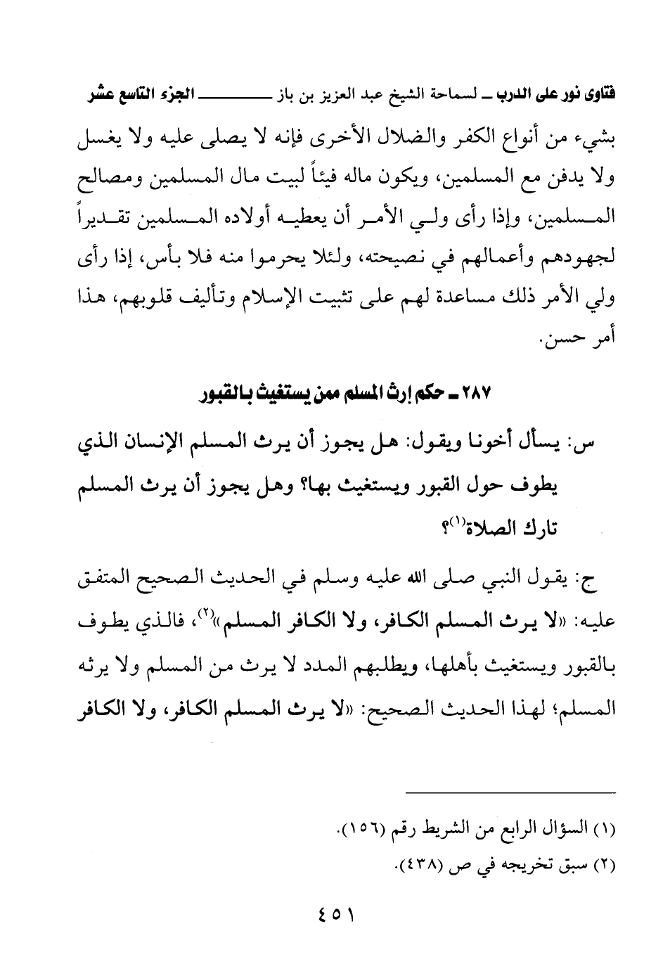 ج: يقول النبي صلى الله عليه وسلم في الحديث الصحيح المتفق عليه: «لا يرث المسلم الكافر، ولا الكافر المسلم» (¬2) فالذي يطوف بالقبور ويستغيث بأهلها، ويطلبهم المدد لا يرث من المسلم ولا يرثه المسلم، لهذا الحديث الصحيح: «لا يرث المسلم الكافر، ولا الكافر