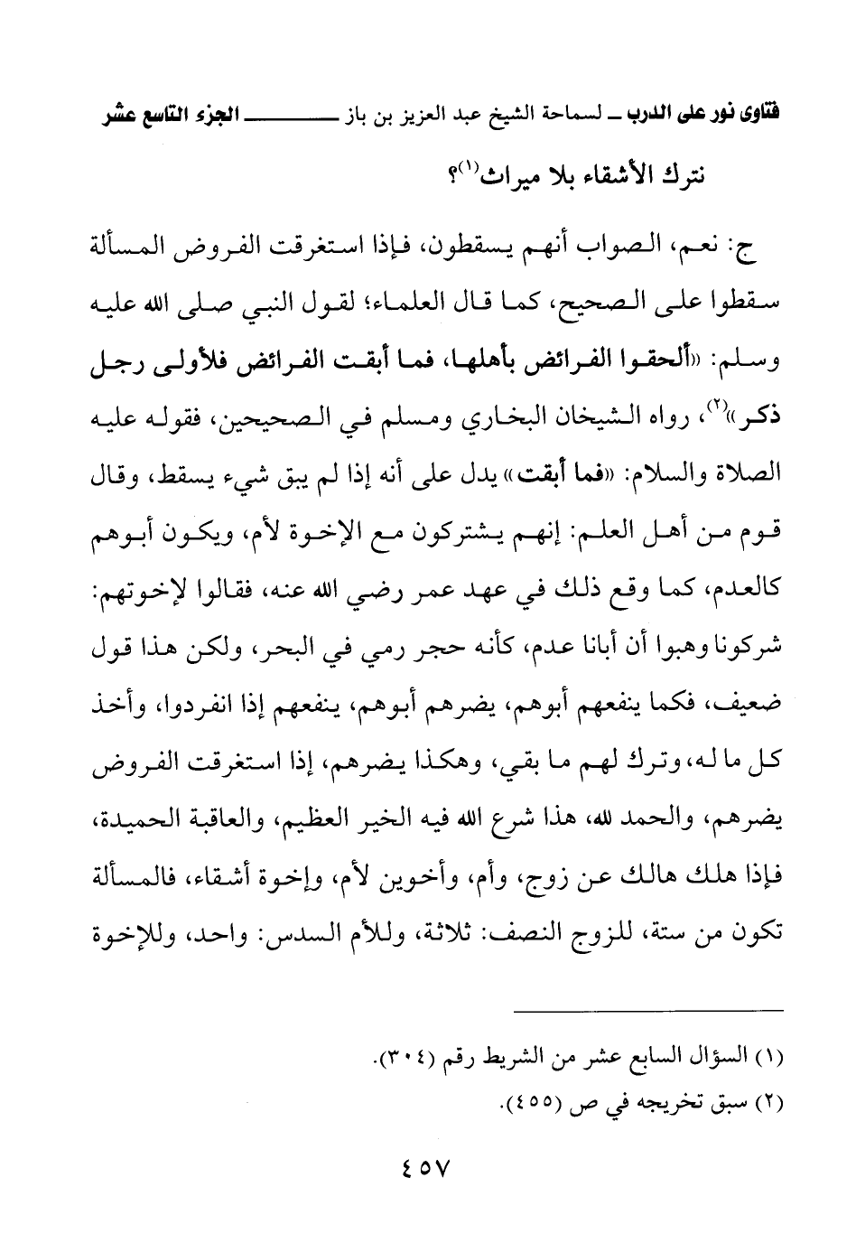ج: نعم، الصواب أنهم يسقطون، فإذا استغرقت الفروض المسألة سقطوا على الصحيح، كما قال العلماء، لقول النبي صلى الله عليه وسلم: «ألحقوا الفرائض بأهلها، فما أبقت الفرائض فلأولى رجل ذكر» (¬3) رواه الشيخان البخاري ومسلم في الصحيحين، فقوله عليه الصلاة والسلام: «فما أبقت». يدل على أنه إذا لم يبق شيء يسقط، وقال قوم من أهل العلم: إنهم يشتركون مع الإخوة لأم، ويكون أبوهم كالعدم، كما وقع ذلك في عهد عمر رضي الله عنه، فقالوا لإخوتهم: شركونا وهبوا أن أبانا عدم، كأنه حجر رمي في البحر، ولكن هذا قول ضعيف، فكما ينفعهم أبوهم، يضرهم أبوهم، ينفعهم إذا انفردوا، وأخذ كل ما له، وترك لهم ما بقي، وهكذا يضرهم، إذا استغرقت الفروض يضرهم، والحمد لله، هذا شرع الله فيه الخير العظيم، والعاقبة الحميدة، فإذا هلك هالك عن زوج، وأم، وأخوين لأم، وإخوة أشقاء، فالمسألة تكون من ستة، للزوج النصف: ثلاثة، وللأم السدس: واحد، وللإخوة