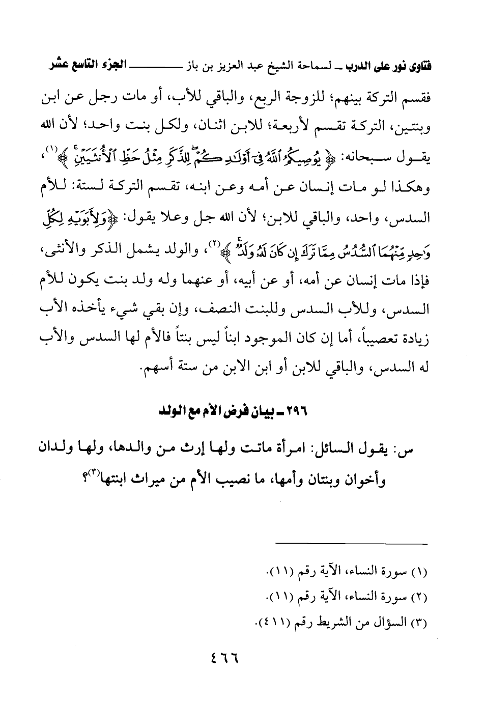 فقسم التركة بينهم، للزوجة الربع، والباقي للأب، أو مات رجل عن ابن وبنتين، التركة تقسم لأربعة، للابن اثنان، ولكن بنت واحد، لأن الله يقول سبحانه: {يُوصِيكُمُ اللَّهُ فِي أَوْلاَدِكُمْ لِلذَّكَرِ مِثْلُ حَظِّ الْأُنْثَيَيْنِ}. وهكذا لو مات إنسان عن أمه وعن ابنه، تقسم التركة لستة: للأم السدس، واحد، والباقي للابن، لأن الله جل وعلا يقول: {وَلِأَبَوَيْهِ لِكُلِّ وَاحِدٍ مِنْهُمَا السُّدُسُ مِمَّا تَرَكَ إِنْ كَانَ لَهُ وَلَدٌ}. والولد يشمل الذكر والأنثى، فإذا مات إنسان عن أمه، أو عن أبيه، أو عنهما وله ولد بنت يكون للأم السدس، وللأب السدس وللبنت النصف، وإن بقي شيء يأخذه الأب زيادة تعصيبًا، أما إن كان الموجود ابنًا ليس بنتًا فالأم لها السدس والأب له السدس، والباقي للابن أو ابن الابن من ستة أسهم.