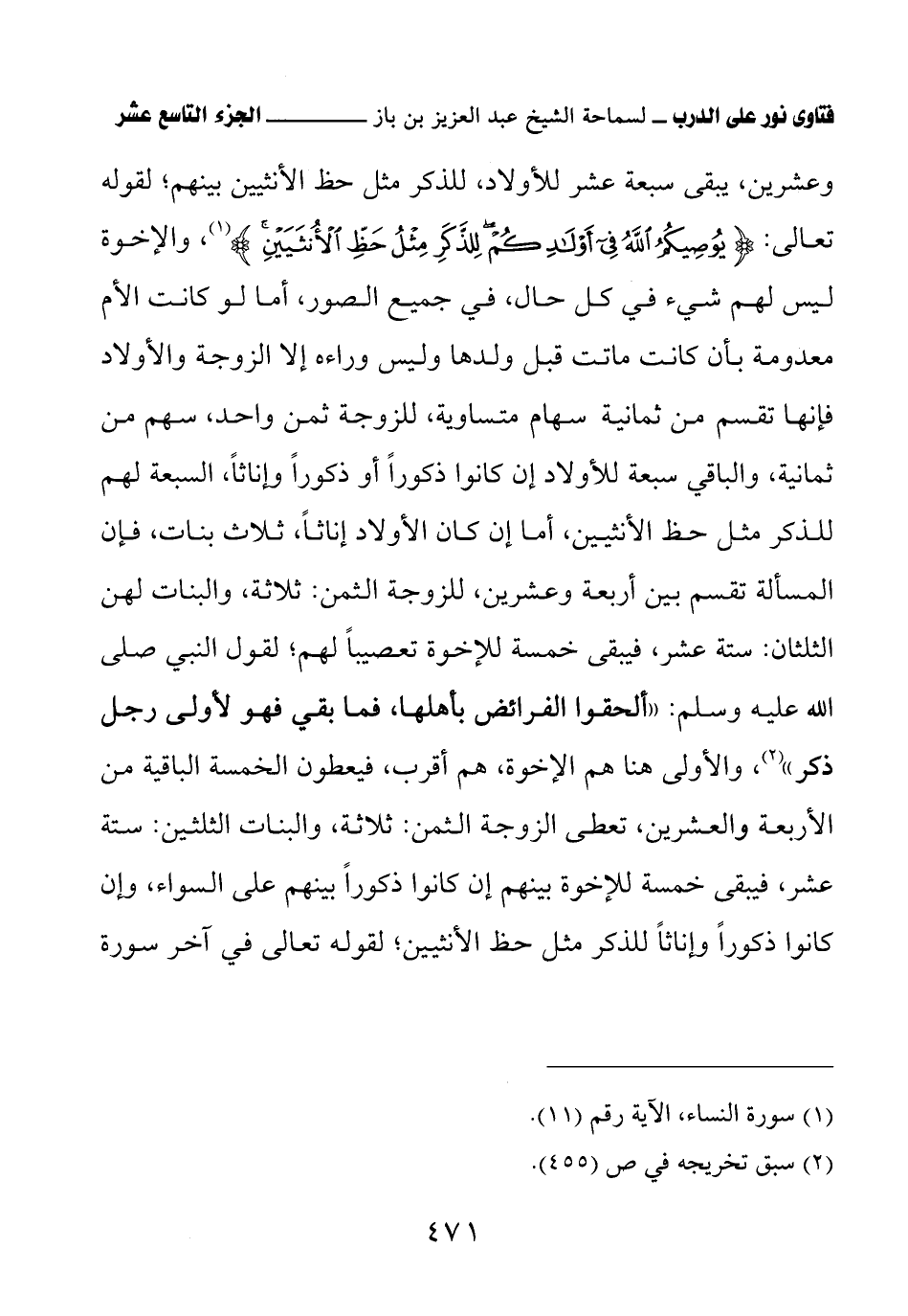 (¬1) أخرجه البخاري في كتاب الفرائض، باب ميراث الولد من أبيه وأمه، برقم (6732)، ومسلم في كتاب الفرائض، باب ألحقوا الفرائض بأهلها فما بقي فلأولى رجل ذكر، برقم (1615).