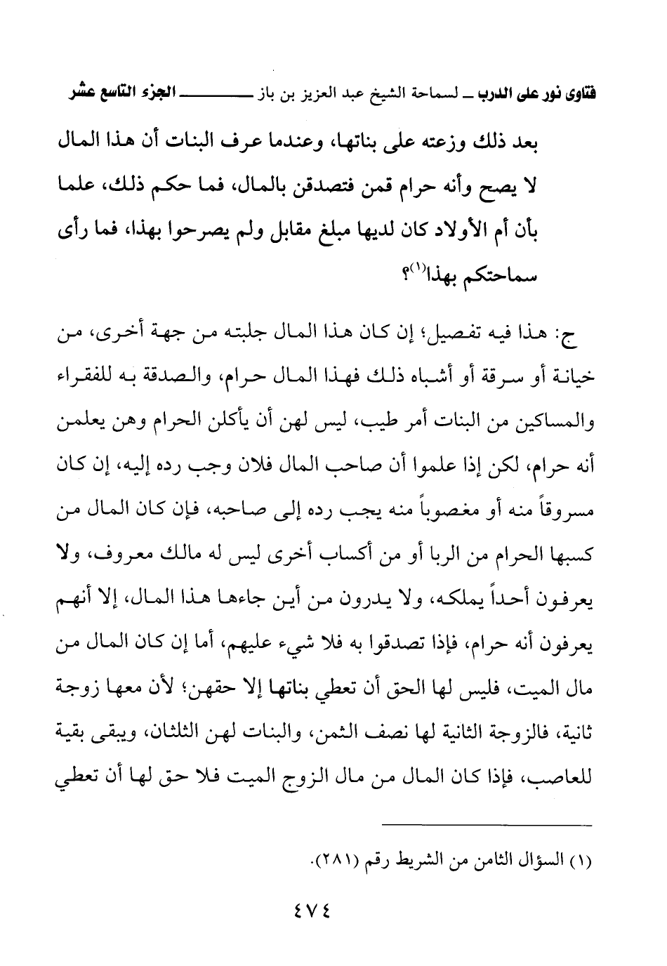 ج: هذا فيه تفصيل، إن كان هذا المال جلبته من جهة أخرى، من خيانة أو سرقة أو أشباه ذلك فهذا المال حرام، والصدقة به للفقراء والمساكين من البنات أمر طيب، ليس لهم أن يأكلن الحرام وهن يعلمن أنه حرام، لكن إذا علموا أن صاحب المال فلان وجب رده إليه، إن كان مسروقًا منه أو مغصوبًا منه يجب رده إلى صاحبه، فإن كان المال من كسبها الحرام من الربا أو من أكساب أخرى ليس له مالك معروف، ولا يعرفون أحدًا يملكه، ولا يدرون من أين جاءها هذا المال، إلا أنهم يعرفون أنه حرام، فإذا تصدقوا به فلا شيء عليهم، أما إن كان المال من مال الميت، فليس لها الحق أن تعطي بناتها إلا حقهن، لأن معها زوجة ثانية، فالزوجة الثانية لها نصف الثمن، والنبات لهن الثلثان، ويبقى بقية للعاصب، فإذا كان المال من مال الزوج الميت فلا حق لها أن تعطي