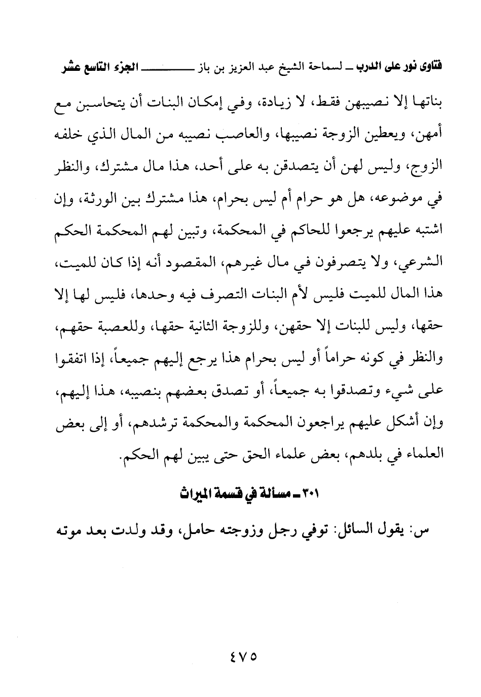 بناتها إلا نصيبهن فقط، لا زيادة، وفي إمكان البنات أن يتحاسبن مع أمهن، ويعطين الزوجة نصيبها، والعاصب نصيبه من المال الذي خلفه الزوج، وليس لهن أن يتصدق به على أحد، هذا مال مشترك، والنظر في موضوعه، هل هو حرام أم ليس بحرام، هذا مشترك بين الورثة، وإن اشتبه عليهم يرجعوا للحاكم في المحكمة وتبين لهم المحكمة الحكم الشرعي، ولا يتصرفون في مال غيرهم، المقصود أنه إذا كان للميت، هذا المال للميت فليس لأم البنات التصرف فيه وحدها، فليس لها إلا حقها، وليس للبنات إلا حقهن، وللزوجة الثانية حقها، وللعصبة حقهم، والنظر في كونه حرامًا أو ليس بحرام هذا يرجع إليهم جميعًا، إذا اتفقوا على شيء وتصدقوا به جميعًا، أو تصدق بعضهم بنصيبه هذا إليهم، وإن أشكل عليهم يراجعون المحكمة والمحكمة ترشدهم، أو إلى بعض العلماء في بلدهم، بعض علماء الحق حتى يبين لهم الحكم.