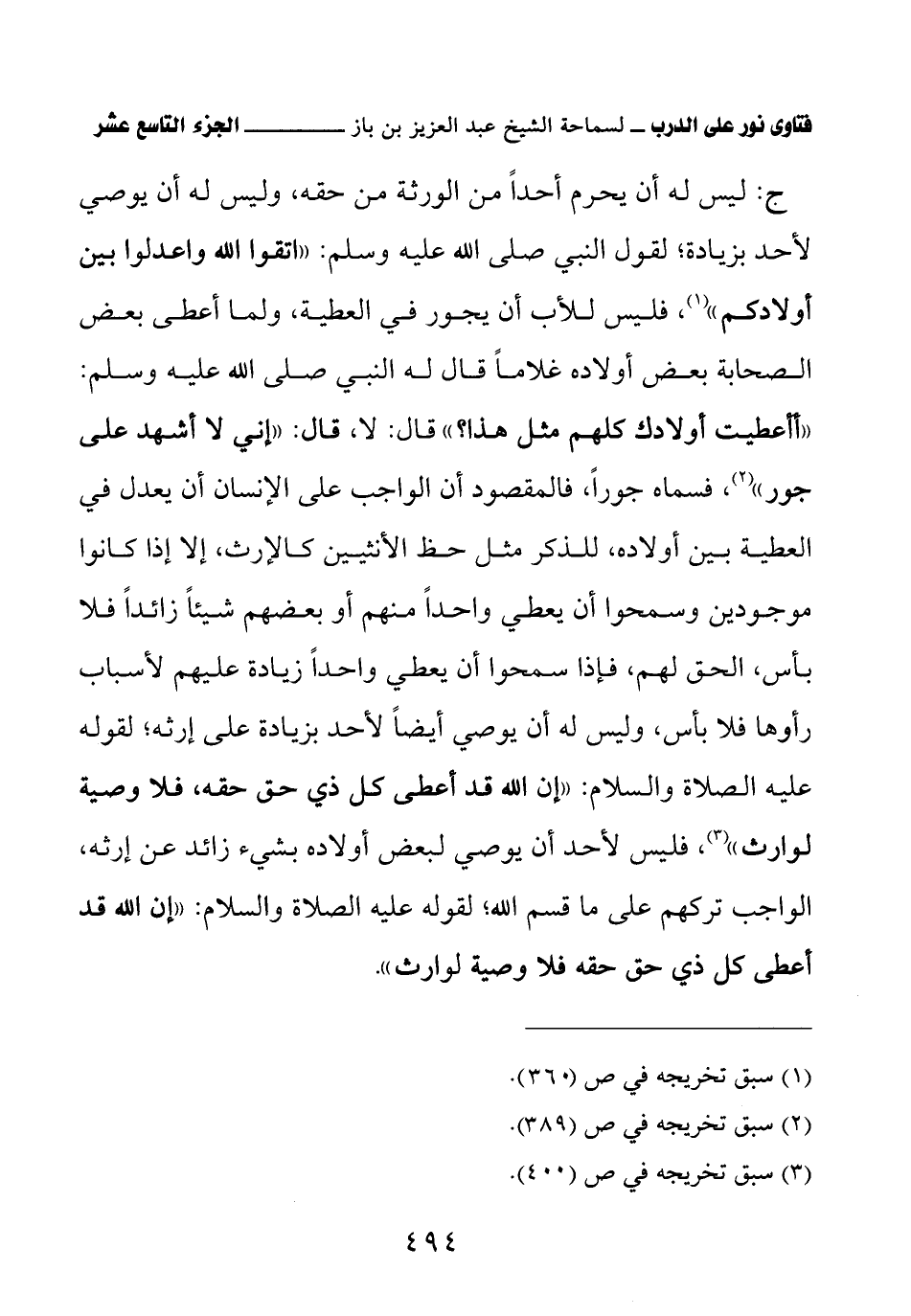 ج: ليس له أن يحرم أحدًا من الورثة من حقه، وليس له أن يوصي لأحد بزيادة، لقول النبي صلى الله عليه وسلم: «اتقوا الله واعدلوا بين أولادكم» (¬1) فليس للأب أن يجور في العطية، ولما أعطى بعض الصحابة بعض أولاده غلامًا قال له النبي صلى الله عليه وسلم: «أأعطيت أولادك كلهم مثل هذا؟. قال: لا، قال: إني لا أشهد على جور» (¬2) فسماه جورًا، فالمقصود أن الواجب على الإنسان أن يعدل في العطية بين أولاده، للذكر مثل حظ الأنثيين كالإرث، إلا إذا كانوا موجودين وسمحوا أن يعطي واحدًا منهم أو بعضهم شيئًا زائدًا فلا بأس، الحق لهم، فإذا سمحوا أن يعطي واحدًا زيادة عليهم لأسباب رأوها فلا بأس، وليس له أن يوصي أيضًا لأحد بزيادة على إرثه، لقوله عليه الصلاة والسلام: «إن الله قد أعطى كل ذي حق حقه، فلا وصية لوارث» (¬3) فليس لأحد أن يوصي لبعض أولاده بشيء زائد عن إرثه، الواجب تركهم على ما قسم الله، لقوله عليه الصلاة والسلام: «إن الله قد أعطى كل ذي حق حقه فلا وصية لوارث» (¬4).