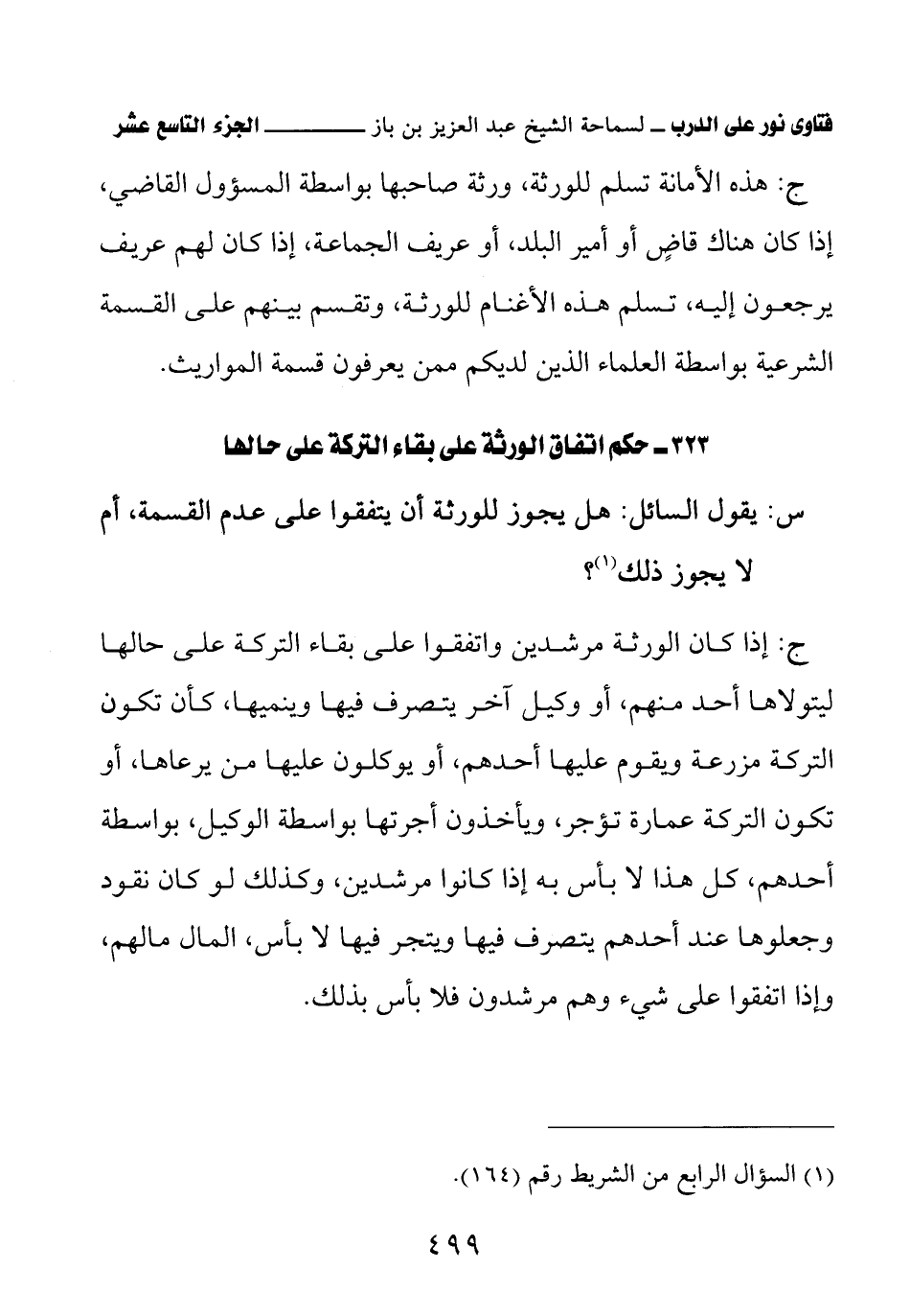 ج: إذا كان الورثة مرشدين واتفقوا على بقاء التركة على حالها ليتولاها أحد منهم، أو وكيل آخر يتصرف فيها وينميها، كأن تكون التركة مزرعة ويقوم عليها أحدهم، أو يوكلون عليها من يرعاها، أو تكون التركة عمارة تؤجر، ويأخذون أجرتها بواسطة الوكيل، بواسطة أحدهم، كل هذا لا بأس به إذا كانوا مرشدين، وكذلك لو كان نقود وجعلوها عند أحدهم يتصرف فيها ويتجر فيها لا بأس، المال مالهم، وإذا اتفقوا على شيء وهم مرشدون فلا بأس بذلك.