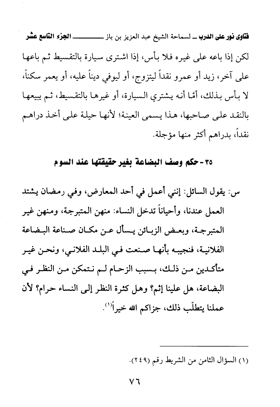 لكن إذا باعه على غيره فلا بأس، إذا اشترى سيارة بالتقسيط ثم باعها على آخر، زيد أو عمرو نقدًا ليتزوج، أو ليوفي دينًا عليه، أو يعمر سكنًا، لا بأس بذلك، أمَّا أنه يشتري السيارة، أو غيرها بالتقسيط، ثم يبيعها بالنقد على صاحبها، هذا يسمى العينة؛ لأنها حيلة على أخذ دراهم نقدًا، بدراهم أكثر منها مؤجلة.