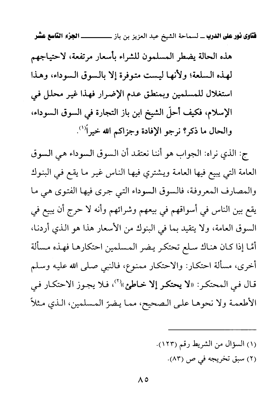ج: الذي نراه: الجواب هو أننا نعتقد أن السوق السوداء هي السوق العامة التي يبيع فيها العامة ويشتري فيها الناس غير ما يقع في البنوك والمصارف المعروفة، فالسوق السوداء التي جرى فيها الفتوى هي ما يقع بين الناس في أسواقهم في بيعهم وشرائهم وأنه لا حرج أن يبيع في السوق العامة، ولا يتقيد بما في البنوك من الأسعار هذا هو الذي أردنا، أمَّا إذا كان هناك سلع تحتكر يضر المسلمين احتكارها فهذه مسألة أخرى، مسألة احتكار: والاحتكار ممنوع، فالنبي صلى الله عليه وسلم قال في المحتكر: «لا يحتكر إلا خاطئ» (¬2) فلا يجوز الاحتكار في الأطعمة ولا نحوها على الصحيح، مما يضرّ المسلمين، الذي مثلاً