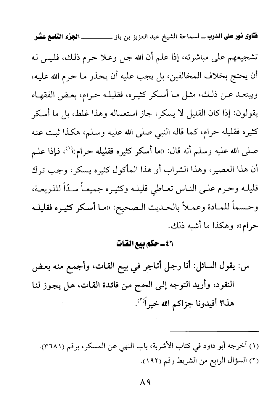 تشجيعهم على مباشرته، إذا علم أن الله جل وعلا حرم ذلك، فليس له أن يحتج بخلاف المخالفين، بل يجب عليه أن يحذر ما حرم الله عليه، ويبتعد عن ذلك، مثل ما أسكر كثيره، فقليله حرام، بعض الفقهاء يقولون: إذا كان القليل لا يسكر، جاز استعماله وهذا غلط، بل ما أسكر كثيره فقليله حرام، كما قاله النبي صلى الله عليه وسلم، هكذا ثبت عنه صلى الله عليه وسلم أنه قال: «ما أسكر كثيره فقليله حرام» (¬1) فإذا علم أن هذا العصير، وهذا الشراب أو هذا المأكول كثيره يسكر، وجب ترك قليله وحرم على الناس تعاطي قليله وكثيره جميعًا سدًّا للذريعة، وحسمًا للمادة وعملاً بالحديث الصحيح: «ما أسكر كثيره فقليله حرام» (¬2)، وهكذا ما أشبه ذلك.