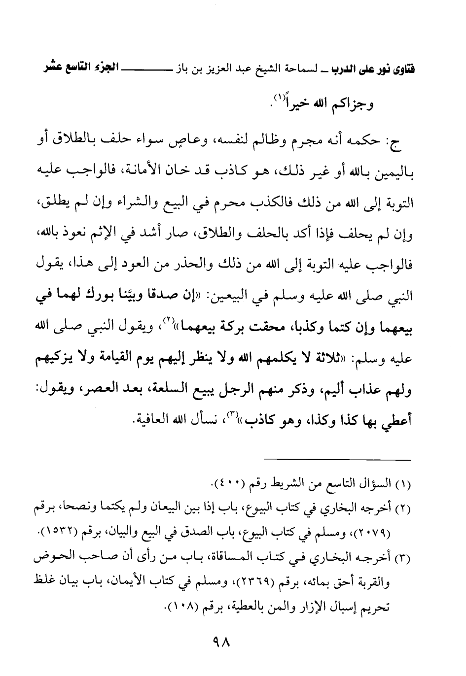 ج: حكمه أنه مجرم وظالم لنفسه، وعاصٍ سواء حلف بالطلاق أو باليمين بالله أو غير ذلك، هو كاذب قد خان الأمانة، فالواجب عليه التوبة إلى الله من ذلك فالكذب محرم في البيع والشراء وإن لم يطلق، وإن لم يحلف فإذا أكد بالحلف والطلاق، صار أشد في الإثم نعوذ بالله، فالواجب عليه التوبة إلى الله من ذلك والحذر من العود إلى هذا، يقول النبي صلى الله عليه وسلم في البيعين: «إن صدقا وبينا بورك لهما في بيعهما وإن كتما وكذبا، محقت بركة بيعهما» (¬2) ويقول النبي صلى الله عليه وسلم: «ثلاثة لا يكلمهم الله ولا ينظر إليهم يوم القيامة ولا يزكيهم ولهم عذاب أليم، وذكر منهم الرجل يبيع السلعة، بعد العصر، ويقول أعطي بها كذا وكذا، وهو كاذب» (¬3) نسأل الله العافية.