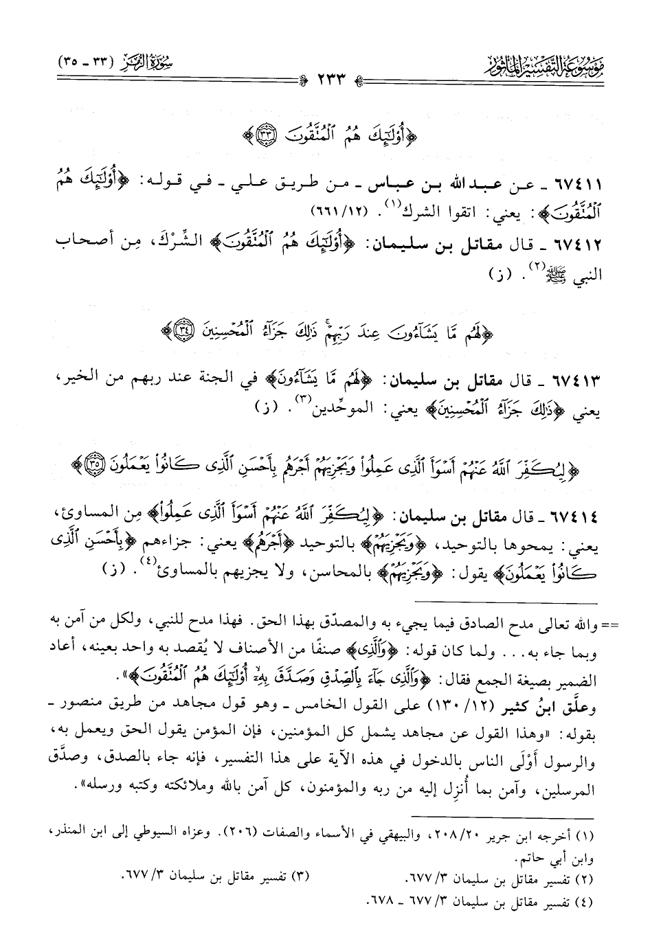 ٦٧٤١٣ - قال مقاتل بن سليمان: {لَهُمْ ما يَشاءُونَ} في الجنة عند ربهم من الخير، يعني {ذَلِكَ جَزاءُ المُحْسِنِينَ} يعني: الموحِّدين (¬٣). (ز)