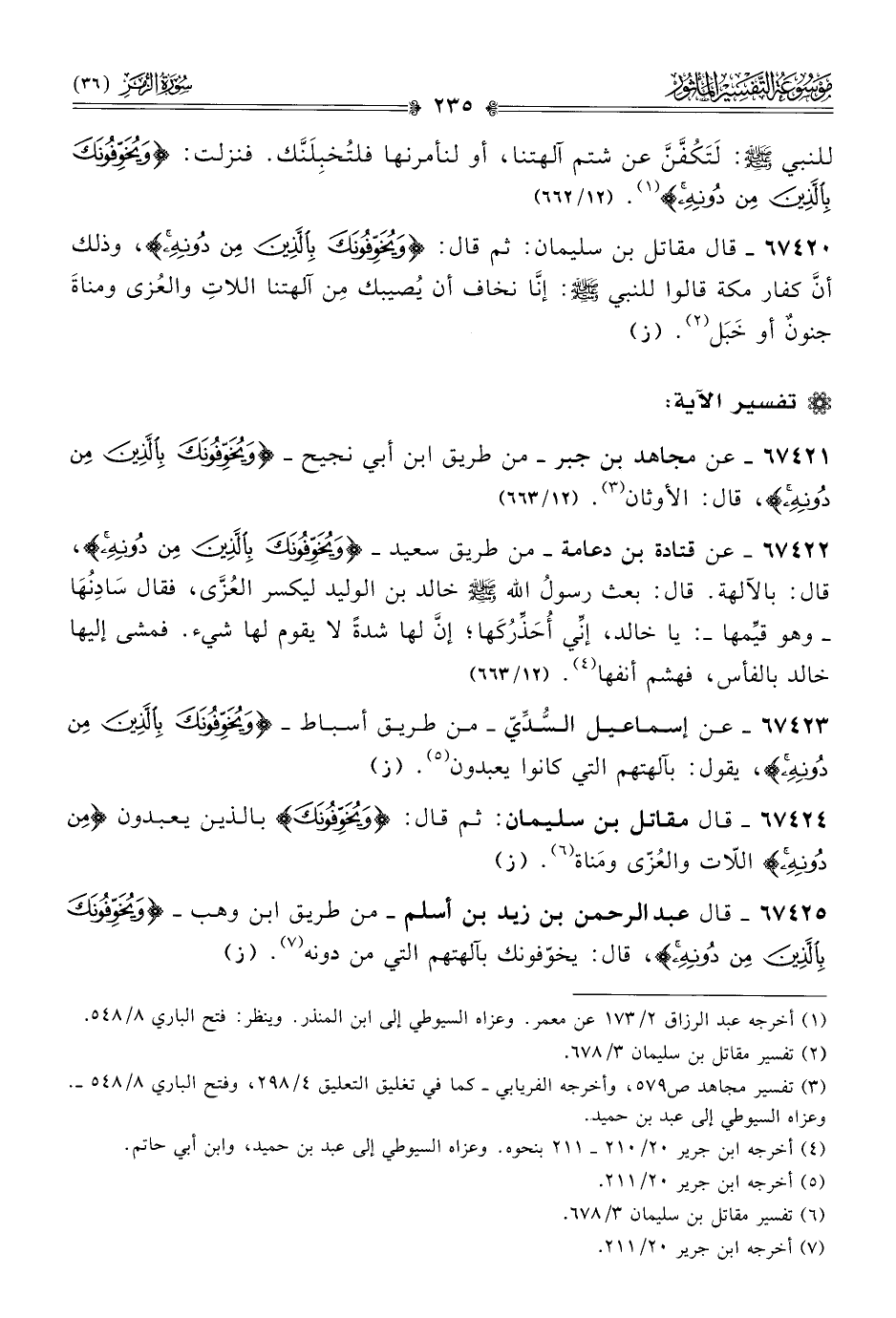 ٦٧٤٢١ - عن مجاهد بن جبر -من طريق ابن أبي نجيح- {ويُخَوِّفُونَكَ بِالَّذِينَ مِن دُونِهِ}، قال: الأوثان (¬٣). (١٢/ ٦٦٣)