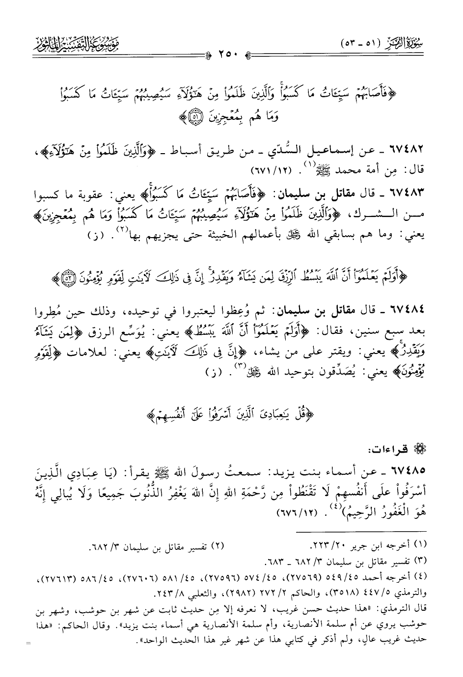 ٦٧٤٨٥ - عن أسماء بنت يزيد: سمعتُ رسولَ الله - صلى الله عليه وسلم - يقرأ: (يا عِبادِي الَّذِينَ أسْرَفُواْ على أنفُسهِمْ لا تَقْنَطُواْ مِن رَّحْمَةِ اللَّهِ إنَّ اللهَ يَغْفِرُ الذُّنُوبَ جَمِيعًا ولا يُبالِي إنَّهُ هُوَ الغَفُورُ الرَّحِيمُ) (¬٤). (١٢/ ٦٧٦)