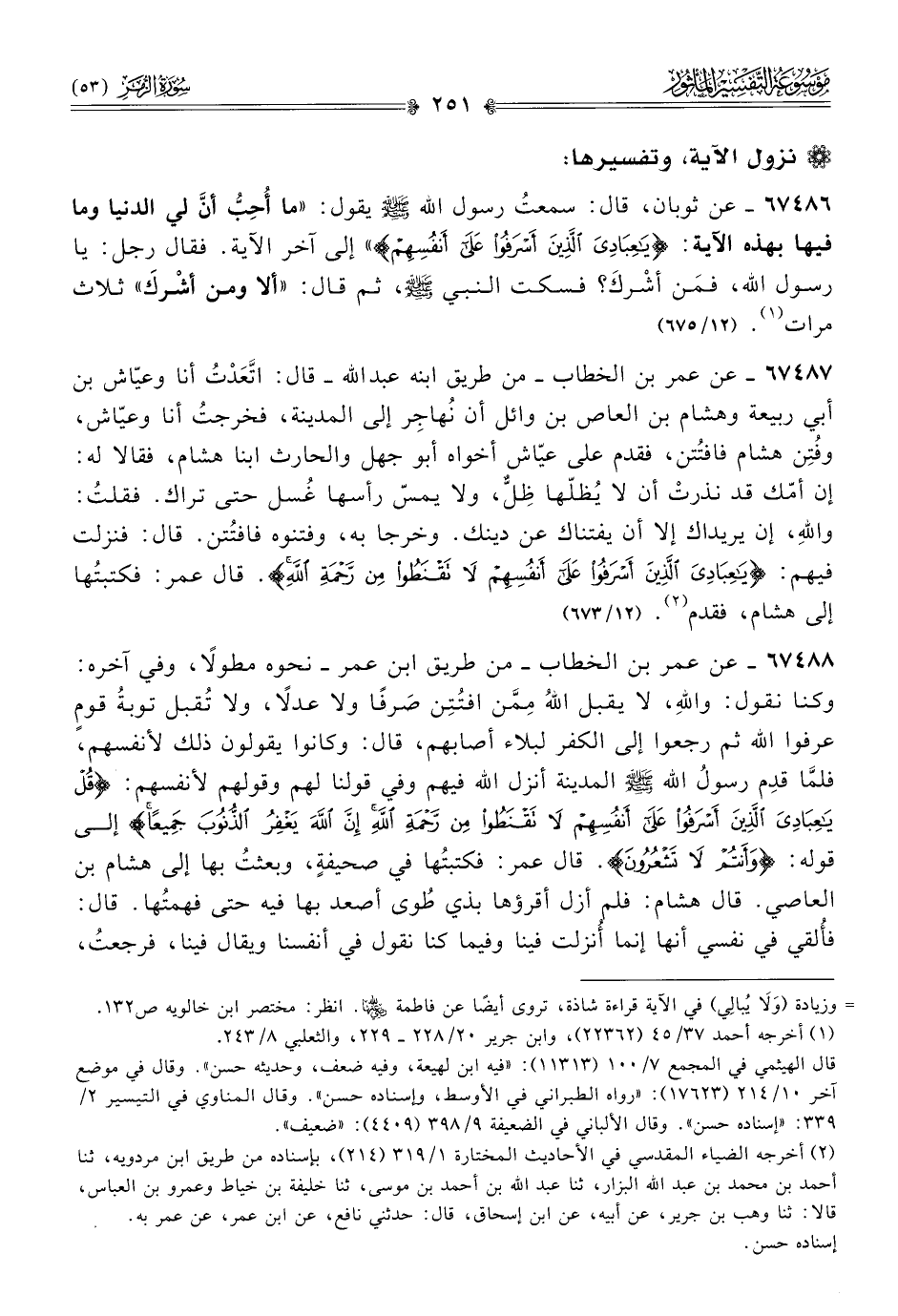 ٦٧٤٨٧ - عن عمر بن الخطاب -من طريق ابنه عبد الله- قال: اتَّعَدْتُ أنا وعيّاش بن أبي ربيعة وهشام بن العاص بن وائل أن نُهاجِر إلى المدينة، فخرجتُ أنا وعيّاش، وفُتِن هشام فافتُتن، فقدم على عيّاش أخواه أبو جهل والحارث ابنا هشام، فقالا له: إن أمّك قد نذرتْ أن لا يُظلّها ظِلٌّ، ولا يمسّ رأسها غُسل حتى تراك. فقلتُ: واللهِ، إن يريداك إلا أن يفتناك عن دينك. وخرجا به، وفتنوه فافتُتن. قال: فنزلت فيهم: {يا عِبادِيَ الَّذِينَ أسْرَفُوا عَلى أنْفُسِهِمْ لا تَقْنَطُوا مِن رَحْمَةِ اللَّهِ}. قال عمر: فكتبتُها إلى هشام، فقدم (¬٢). (١٢/ ٦٧٣)