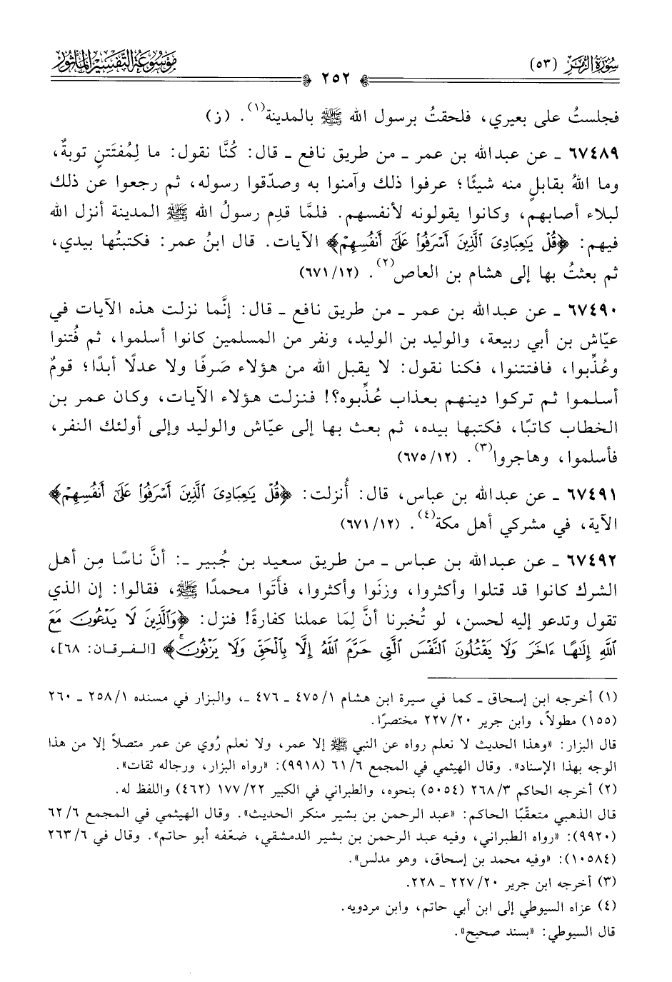 ٦٧٤٨٩ - عن عبد الله بن عمر -من طريق نافع- قال: كُنّا نقول: ما لِمُفتَتنٍ توبةٌ، وما اللهُ بقابلٍ منه شيئًا؛ عرفوا ذلك وآمنوا به وصدّقوا رسوله، ثم رجعوا عن ذلك لبلاء أصابهم، وكانوا يقولونه لأنفسهم. فلمّا قدِم رسولُ الله - صلى الله عليه وسلم - المدينة أنزل الله فيهم: {قُلْ يا عِبادِيَ الَّذِينَ أسْرَفُوا عَلى أنْفُسِهِمْ} الآيات. قال ابنُ عمر: فكتبتُها بيدي، ثم بعثتُ بها إلى هشام بن العاص (¬٢). (١٢/ ٦٧١)