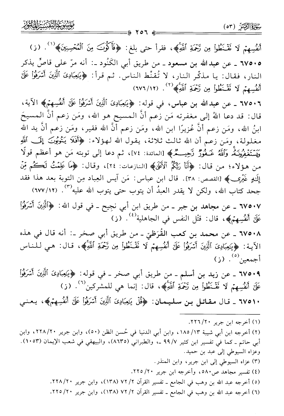 ٦٧٥٠٩ - عن زيد بن أسلم -من طريق أبي صخر- في قوله: {يا عِبادِيَ الَّذِينَ أسْرَفُوا عَلى أنْفُسِهِمْ لا تَقْنَطُوا مِن رَحْمَةِ اللَّه}، قال: إنما هي للمشركين (¬٦). (ز)