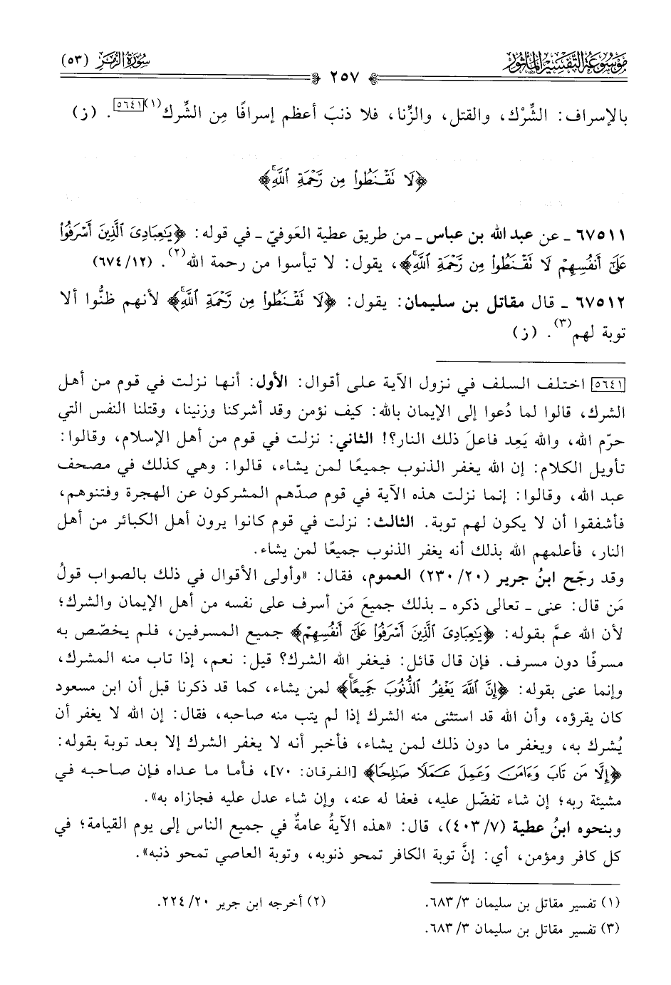 ٦٧٥١٢ - قال مقاتل بن سليمان: يقول: {لا تَقْنَطُوا مِن رَحْمَةِ اللَّه} لأنهم ظنُّوا ألا توبة لهم (¬٣). (ز)
