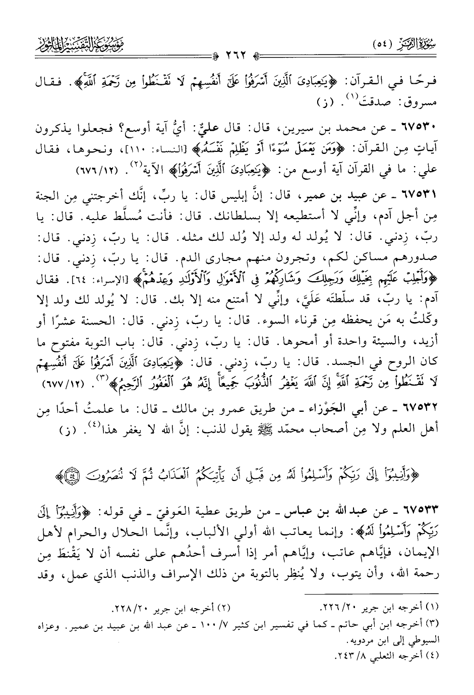 ٦٧٥٣٣ - عن عبد الله بن عباس -من طريق عطية العَوفيّ- في قوله: {وأَنِيبُوا إلى رَبِّكُمْ وأَسْلِمُوا لَهُ}: وإنما يعاتب الله أولي الألباب، وإنّما الحلال والحرام لأهل الإيمان، فإيّاهم عاتب، وإيّاهم أمر إذا أسرف أحدُهم على نفسه أن لا يَقْنطَ مِن رحمة الله، وأن يتوب، ولا يُنظِر بالتوبة من ذلك الإسراف والذنب الذي عمل، وقد