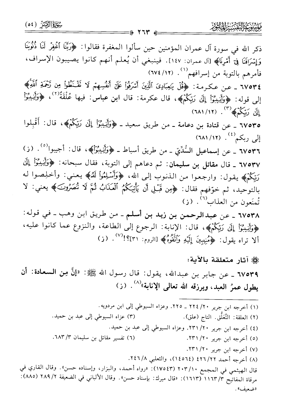 ٦٧٥٣٥ - عن قتادة بن دعامة -من طريق سعيد- {وأَنِيبُوا إلى رَبِّكُمْ}، قال: أقْبِلوا إلى ربكم (¬٤). (١٢/ ٦٨١)