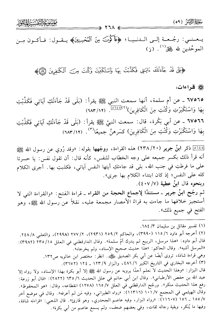 ٦٧٥٦٥ - عن أم سلمة، أنها سمعت النبي - صلى الله عليه وسلم - يقرأ: (بَلى قَدْ جَآءَتْكِ آياتِي فَكَذَّبْتِ بِها واسْتَكْبَرْتِ وكُنْتِ مِنَ الكافِرِينَ) (¬٢) [٥٦٤٥]. (١٢/ ٦٨٣)